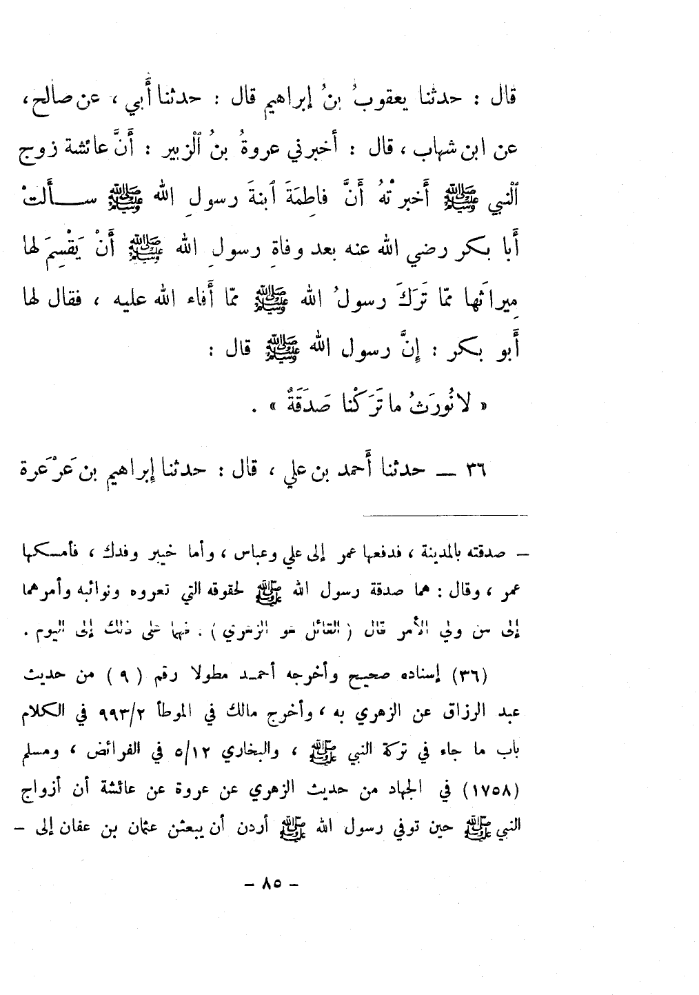 36 - حَدَّثَنَا أَحْمَدُ بْنُ عَلِيٍّ قَالَ: حَدَّثَنَا إِبْرَاهِيمُ بْنُ عَرْعَرَةَ , قَالَ: حَدَّثَنَا عَبْدُ الرَّزَّاقِ , قَالَ: حَدَّثَنَا مَعْمَرٌ , عَنِ الزُّهْرِيِّ , عَنْ عُرْوَةَ , عَنْ عَائِشَةَ , رَضِيَ اللَّهُ عَنْهَا قَالَتْ: قَالَ أَبُو بَكْرٍ رَضِيَ اللَّهُ عَنْهُ: قَالَ رَسُولُ اللَّهِ صَلَّى اللهُ عَلَيْهِ وَسَلَّمَ: «§لَا نُورَثُ , مَا تَرَكْنَا صَدَقَةٌ»