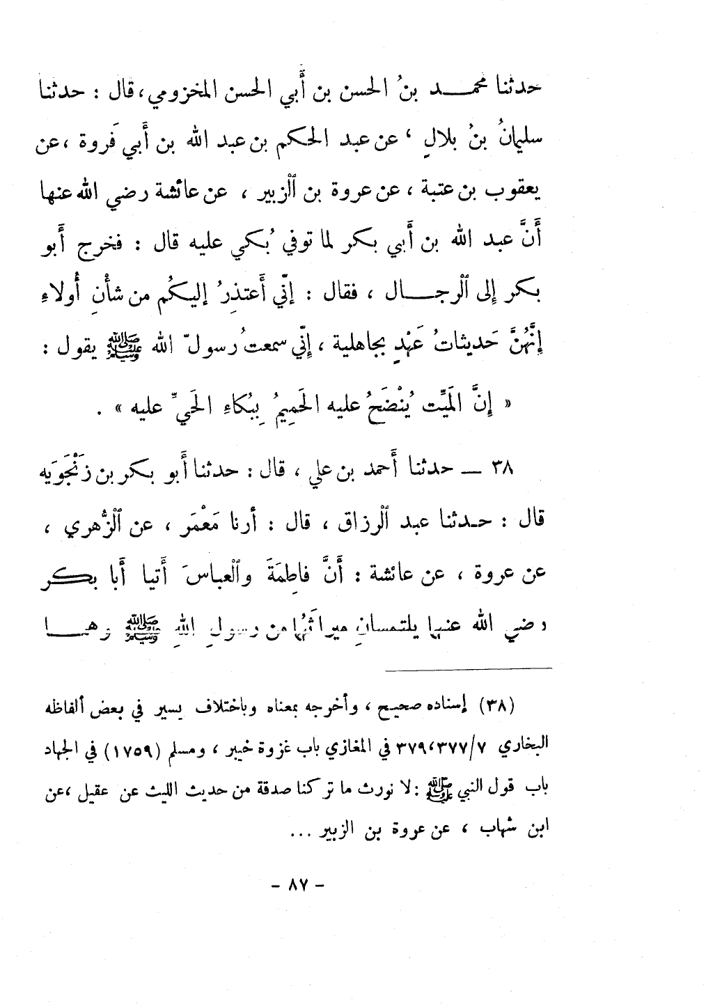 38 - حَدَّثَنَا أَحْمَدُ بْنُ عَلِيٍّ قَالَ: حَدَّثَنَا أَبُو بَكْرِ بْنُ زَنْجَوَيْهِ قَالَ: حَدَّثَنَا عَبْدُ الرَّزَّاقِ قَالَ: أَرَنَا مَعْمَرٌ , عَنِ الزُّهْرِيِّ , عَنْ عُرْوَةَ , عَنْ عَائِشَةَ , أَنَّ فَاطِمَةَ , وَالْعَبَّاسَ , أَتَيَا أَبَا بَكْرٍ رَضِيَ اللَّهُ عَنْهُمَا يَلْتَمِسَانِ مِيرَاثَهُمَا مِنْ رَسُولِ اللَّهِ صَلَّى اللهُ عَلَيْهِ وَسَلَّمَ , وَهُمَا -[88]- حِينَئِذٍ يَطْلُبَانِ أَرْضَهُ مِنْ فَدَكٍ وَسَهْمَهُ مِنْ خَيْبَرَ فَقَالَ لَهُمَا أَبُو بَكْرٍ: سَمِعْتُ رَسُولَ اللَّهِ صَلَّى اللهُ عَلَيْهِ وَسَلَّمَ يَقُولُ: «§لَا نُورَثُ , مَا تَرَكْنَا صَدَقَةٌ , إِنَّمَا يَأْكُلُ آلُ مُحَمَّدٍ صَلَّى اللهُ عَلَيْهِ وَسَلَّمَ فِي هَذَا الْمَالِ» وَإِنِّي وَاللَّهِ لَا ادْعُ أَمْرًا رَأَيْتُ رَسُولَ اللَّهِ صَلَّى اللهُ عَلَيْهِ وَسَلَّمَ يَصْنَعُهُ فِيهِ إِلَّا صَنَعْتُهُ , قَالَتْ: فَهَجَرَتْهُ فَاطِمَةُ , فَلَمْ تُكَلِّمْهُ فِي ذَلِكَ حَتَّى مَاتَتْ , فَدَفَنَهَا عَلِيٌّ رَضِيَ اللَّهُ عَنْهُ لَيْلًا , وَلَمْ يُؤْذَنَ بِهَا أَبُو بَكْرٍ , قَالَتْ: فَكَانَ لِعَلِيٍّ رَضِيَ اللَّهُ عَنْهُ وَجْهٌ مِنَ النَّاسِ حَيَاةَ فَاطِمَةَ رَضِيَ اللَّهُ عَنْهَا , فَلَمَّا تُوُفِّيَتْ فَاطِمَةُ انْصَرَفَتْ وُجُوهُ النَّاسِ عَنْ عَلِيٍّ , فَمَكَثَتْ فَاطِمَةُ سِتَّةَ أَشْهُرٍ بَعْدَ رَسُولِ اللَّهِ صَلَّى اللهُ عَلَيْهِ وَسَلَّمَ , ثُمَّ تُوُفِّيَتْ , قَالَ مَعْمَرٌ: فَقَالَ رَجُلٌ لِلزُّهْرِيِّ رَحِمَهُ اللَّهُ: فَلَمْ يُبَايِعْهُ سِتَّةَ أَشْهُرٍ قَالَ: لَا وَلَا أَحَدٌ مِنْ بَنِي هَاشِمٍ حَتَّى بَايَعَهُ عَلِيٌّ -[89]- قَالَ: فَلَمَّا رَأَى عَلِيٌّ انْصِرَافَ وُجُوهِ النَّاسِ عَنْهُ ضَرَعَ إِلَى مُصَالَحَةِ أَبِي بَكْرٍ , فَأَرْسَلَ إِلَى أَبِي بَكْرٍ رَضِيَ اللَّهُ عَنْهُ: ائْتِنَا , وَلَا تَأْتِنَا بِأَحَدٍ مَعَكَ , وَكَرِهَ أَنْ يَأْتِيَهُ عُمَرُ لِمَا عَلِمَ مِنْ شِدَّةِ عُمَرَ , فَقَالَ عُمَرُ: لَا تَأْتِهِمْ وَحْدَكَ , فَقَالَ أَبُو بَكْرٍ: وَاللَّهِ لَآتِيَنَّهُمْ وَحْدِي , وَمَا عَسَى أَنْ يَصْنَعُوا بِي , فَانْطَلَقَ أَبُو بَكْرٍ , فَدَخَلَ عَلَى عَلِيٍّ رَضِيَ اللَّهُ عَنْهُ , وَقَدْ جَمَعَ بَنِي هَاشِمٍ عِنْدَهُ , فَقَامَ عَلِيٌّ فَحَمِدَ اللَّهَ وَأَثْنَى عَلَيْهِ بِمَا هُوَ أَهْلُهُ , ثُمَّ قَالَ: أَمَّا بَعْدُ فَإِنَّهُ لَمْ يَمْنَعْنَا أَنْ نُبَايِعَكَ يَا أَبَا بَكْرٍ إِنْكَارٌ لِفَضِيلَتِكَ , وَلَا نَفَاسَةٌ عَلَيْكَ لَخَيْرٍ سَاقَهُ اللَّهُ إِلَيْكَ , وَلَكِنَّا كُنَّا نَرَى أَنَّ لَنَا فِي هَذَا الْأَمْرِ حَقًّا , فَاسْتَبْدَدْتُمْ عَلَيْنَا , ثُمَّ ذَكَرَ قَرَابَتَهُ مِنْ رَسُولِ اللَّهِ صَلَّى اللهُ عَلَيْهِ وَسَلَّمَ وَحَقَّهُمْ , فَلَمْ يَزَلْ يَذْكُرُ ذَلِكَ حَتَّى بَكَى أَبُو بَكْرٍ , -[90]- فَلَمَّا صَمَتَ عَلِيٌّ تَشَهَّدَ أَبُو بَكْرٍ فَحَمِدَ اللَّهَ وَأَثْنَى عَلَيْهِ بِمَا هُوَ أَهْلُهُ , ثُمَّ قَالَ: أَمَّا بَعْدُ فَوَاللَّهِ لَقَرَابَةُ رَسُولِ اللَّهِ صَلَّى اللهُ عَلَيْهِ وَسَلَّمَ أَحَبُّ إِلَيَّ أَنْ أَصِلَ مِنْ قَرَابَتِي , وَإِنِّي وَاللَّهِ مَا أَلَوْتُ فِي هَذِهِ الْأُمُورِ الَّتِي كَانَتْ بَيْنِي وَبَيْنَكُمْ عَنِ الْخَيْرِ , وَلَكِنِّي سَمِعْتُ رَسُولَ اللَّهِ صَلَّى اللهُ عَلَيْهِ وَسَلَّمَ يَقُولُ: «لَا نُورَثُ , مَا تَرَكْنَا صَدَقَةٌ , إِنَّمَا يَأْكُلُ آلُ مُحَمَّدٍ فِي هَذَا الْمَالِ» , وَإِنِّي وَاللَّهِ لَا أَذْكُرُ أَمْرًا صَنَعَهُ فِيهِ إِلَّا صَنَعْتُهُ إِنْ شَاءَ اللَّهُ , ثُمَّ قَالَ عَلِيٌّ رَضِيَ اللَّهُ عَنْهُ: مَوْعِدُكَ الْعَشِيَّةُ لِلْبَيْعَةِ , فَلَمَّا صَلَّى أَبُو بَكْرٍ رَضِيَ اللَّهُ عَنْهُ الظُّهْرَ أَقْبَلَ عَلَى النَّاسِ , ثُمَ