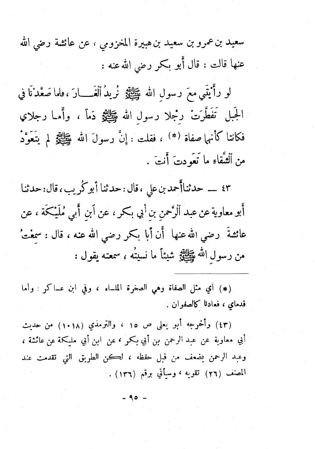 43 - حَدَّثَنَا أَحْمَدُ بْنُ عَلِيٍّ قَالَ: حَدَّثَنَا أَبُو كُرَيْبٍ قَالَ: حَدَّثَنَا أَبُو مُعَاوِيَةَ , عَنْ عَبْدِ الرَّحْمَنِ بْنِ أَبِي بَكْرٍ , عَنِ ابْنِ أَبِي مُلَيْكَةَ , عَنْ عَائِشَةَ رَضِيَ اللَّهُ عَنْهَا أَنَّ أَبَا بَكْرٍ رَضِيَ اللَّهُ عَنْهُ قَالَ: سَمِعْتُ مِنْ رَسُولِ اللَّهِ صَلَّى اللهُ عَلَيْهِ وَسَلَّمَ شَيْئًا مَا نَسِيتُهُ , سَمِعْتُهُ يَقُولُ: «§مَا قَبَضَ اللَّهُ نَبِيًّا إِلَّا فِي الْمَوْضِعِ الَّذِي يُحِبُّ أَنْ يُدْفَنَ فِيهِ» , ادْفِنُوهُ فِي مَوْضِعِ فِرَاشِهِ