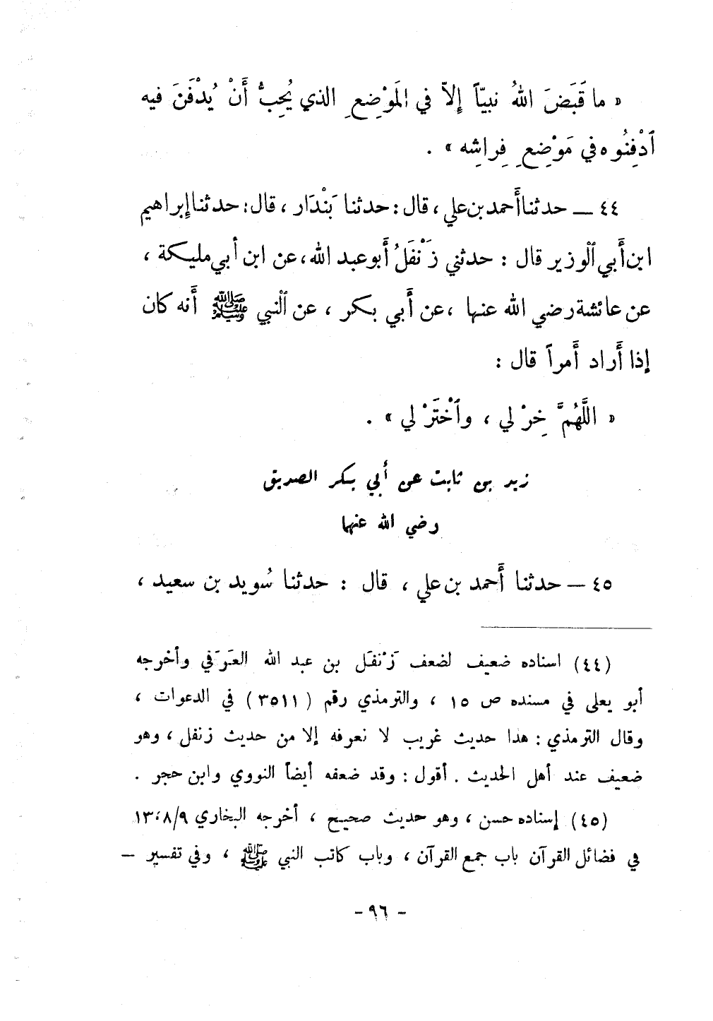 44 - حَدَّثَنَا أَحْمَدُ بْنُ عَلِيٍّ قَالَ: حَدَّثَنَا بُنْدَارٌ قَالَ: حَدَّثَنَا إِبْرَاهِيمُ بْنُ أَبِي الْوَزِيرِ قَالَ: حَدَّثَنِي زَنْفَلٌ أَبُو عَبْدِ اللَّهِ , عَنِ ابْنِ أَبِي مُلَيْكَةَ , عَنْ عَائِشَةَ , رَضِيَ اللَّهُ عَنْهَا , عَنْ أَبِي بَكْرٍ , عَنِ النَّبِيِّ صَلَّى اللهُ عَلَيْهِ وَسَلَّمَ أَنَّهُ كَانَ إِذَا أَرَادَ أَمْرًا قَالَ: «§اللَّهُمُّ خِرْ لِي وَاخْتَرْ لِي»