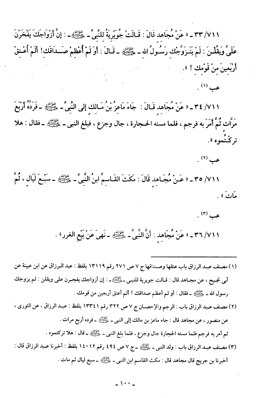 711/ 34 - "عَنْ مُجَاهِدٍ قَالَ: جَاءَ مَاعِزُ بْنُ مَالِكٍ إلى النَّبِىِّ -صلى اللَّه عليه وسلم- فَرَدَّهُ أَرْبَعَ مَرَّاتٍ ثُمَّ أَمَرَ به فرجم، فلما مسته الحجارة، جال وجزع، فبلغ النبى -صلى اللَّه عليه وسلم- فقال: هلا تركْتُموه".