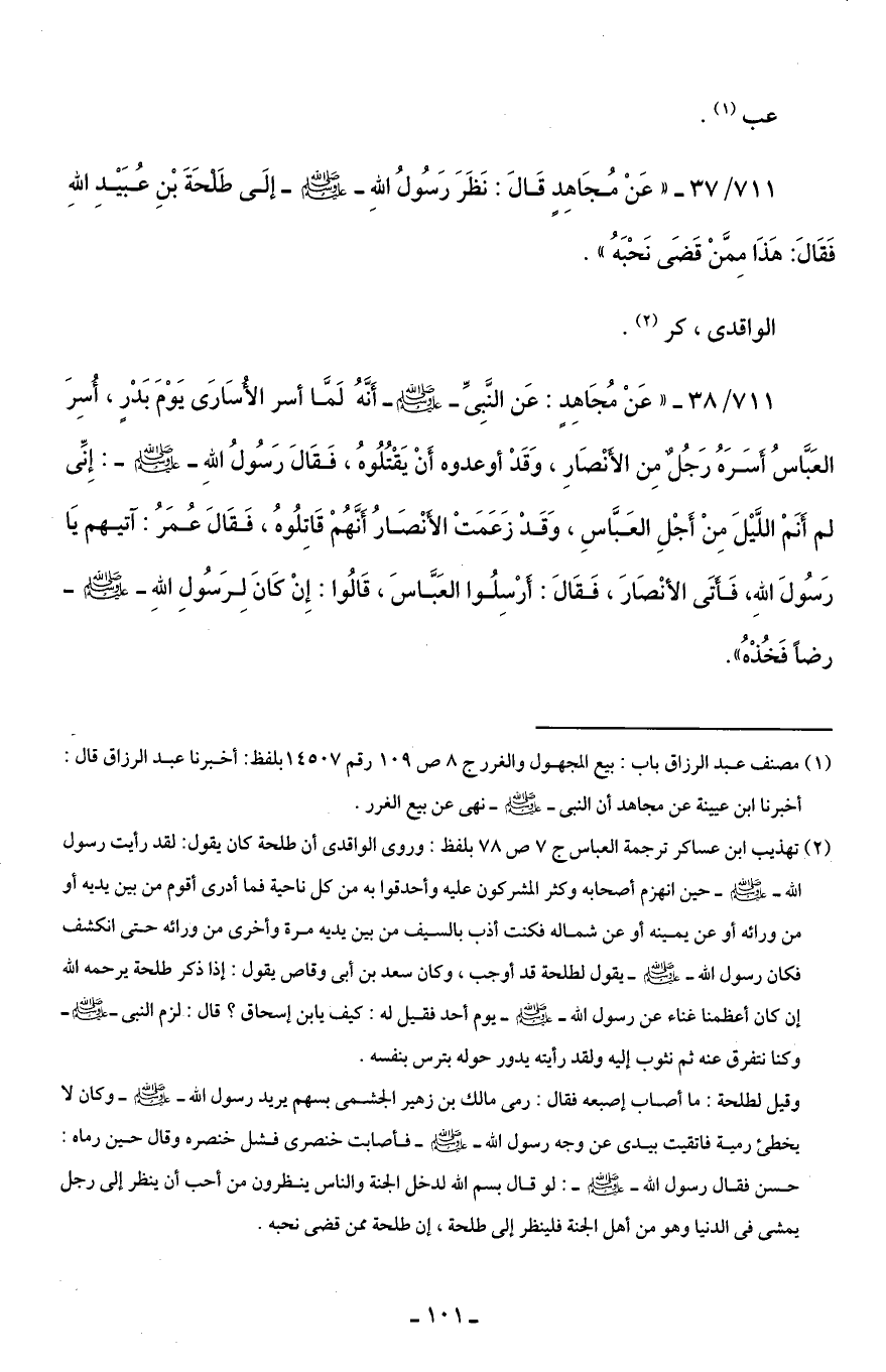 711/ 37 - "عَنْ مُجَاهِدٍ قَالَ: نَظَرَ رَسُولُ اللَّهِ -صلى اللَّه عليه وسلم- إلَى طَلْحَةَ بْنِ عُبَيْدِ اللَّهِ فَقَالَ: هَذَا مِمَّنْ قَضَى نَحْبَهُ".