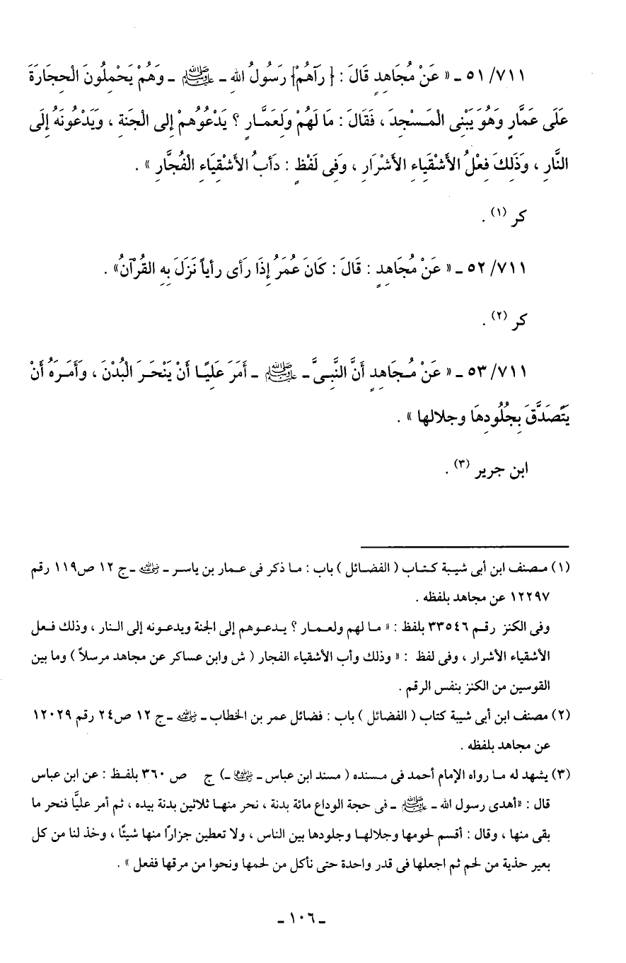 711/ 51 - "عَنْ مُجَاهِدٍ قَالَ: [رآهُمْ] رَسُولُ اللَّهِ -صلى اللَّه عليه وسلم- وَهُمْ بَحْمِلُونَ الْحِجَارَةَ عَلَى عَمَّارٍ وَهُوَ يَبْنِى الْمَسْجِدَ، فَقَالَ: مَا لَهُمْ وَلِعَمَّارٍ؟ يَدْعُوُهمْ إِلى الْجَنَّةِ، وَيَدْعُونَهُ إِلَى النَّارِ، وَذَلِكَ فِعْلُ الأَشْقَيِاءِ الأَشْرَارِ، وَفِى لَفْظٍ: دَأبُ الأَشْقِيَاءِ الْفُجَّارِ".