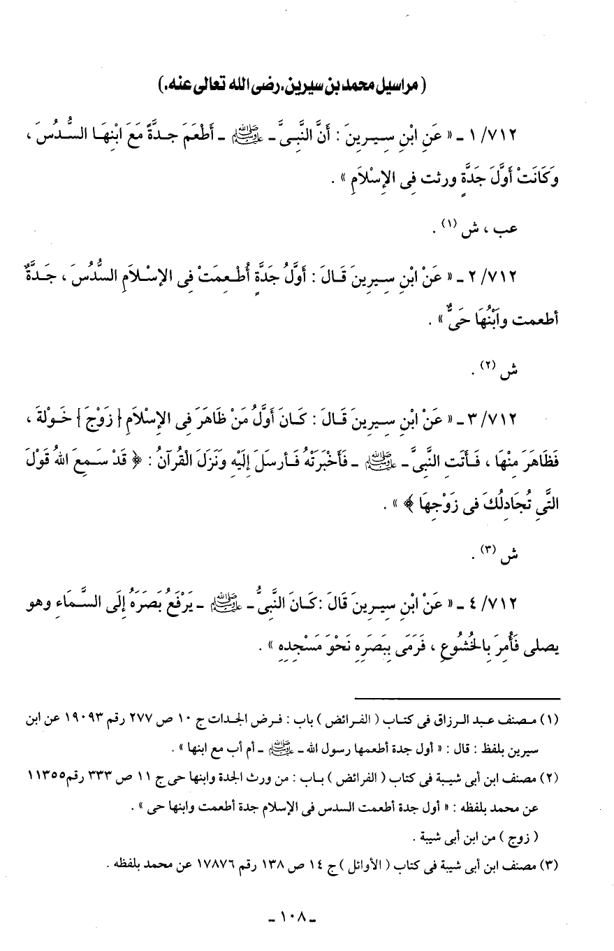 712/ 1 - " عَنِ ابْنِ سِيريِنَ: أَنَّ النَّبِىَّ -صلى اللَّه عليه وسلم- أَطْعَمَ جدَّةً مَعَ ابْنِهَا السُّدُسَ، وَكَانَتْ أَوَّلَ جَدَّةٍ ورثت فِى الإِسْلَامِ".