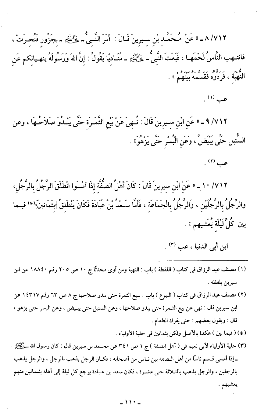 712/ 9 - "عَنِ ابْنِ سِيرِينَ قَالَ: نُهِىَ عَنْ بَيْعِ الثَّمَرَةِ حَتَّى يَبْدُوَ صَلَاحُهَا، وعن السُّنبل حَتَّى يَبْيَضَّ، وَعَنِ الْبُسْرِ حَتَّى يَزْهُوَ".