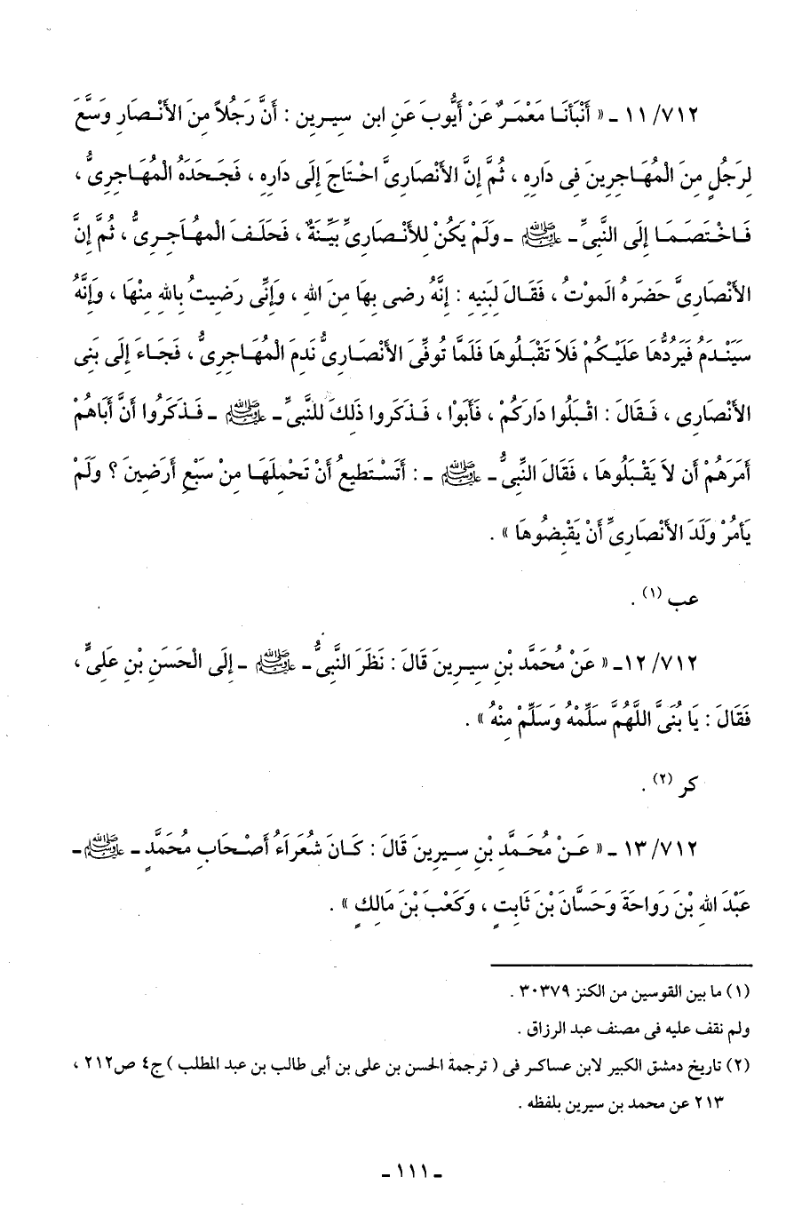 712/ 13 - "عَنْ مُحَمَّدِ بْنِ سِيرِينَ قَالَ: كَانَ شُعَراءُ أَصْحَابِ مُحَمَّدٍ -صلى اللَّه عليه وسلم- عَبْدَ اللَّهِ بْنَ رَواحَةَ وَحَسَّانَ بْنَ ثَابِتٍ، وَكَعْبَ بْنَ مَالِكٍ".