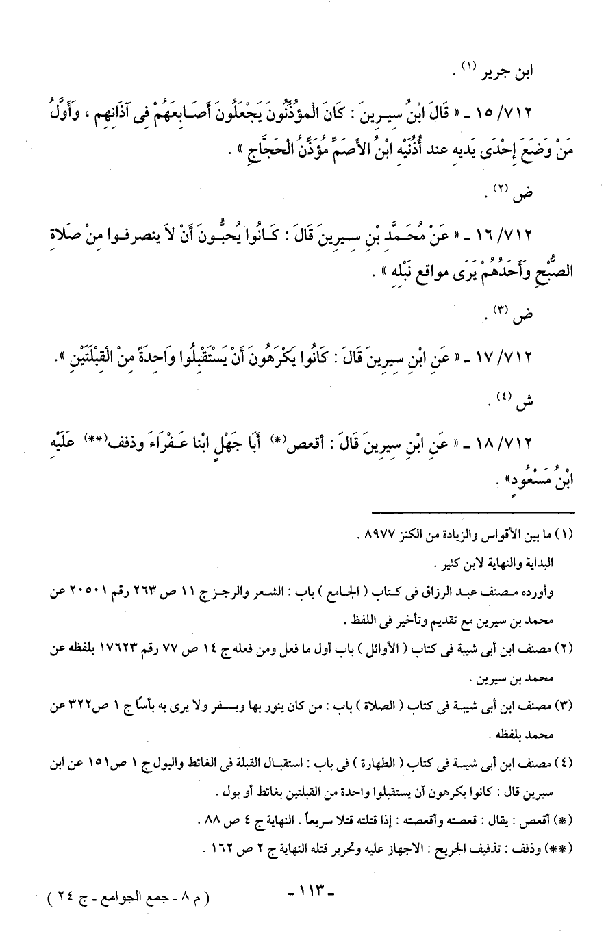 712/ 18 - "عَنِ ابْنِ سِيرِينَ قَالَ: أقعص (*) أَبَا جَهْلٍ ابْنا عَفْرَاءَ وذفف (* *) عَلَيْهِ ابْنُ مَسْعُودٍ".