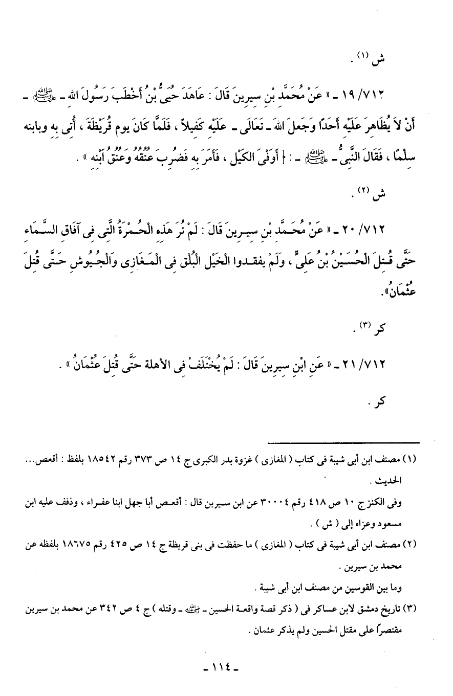 (¬3) تاريخ دمشق لابن عساكر في (ذكر قصة واقعة الحسين -رضي اللَّه عنه- وقتله) جـ 4 ص 342 عن محمد بن سيرين مقتصرًا على مقتل الحسين ولم يذكر عثمان.