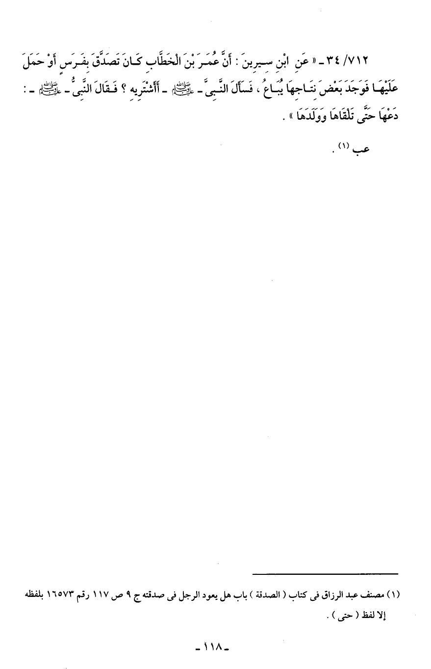 712/ 34 - "عَنِ ابْنِ سِيرِينَ: أَنَّ عُمَرَ بْنَ الخَطَّابِ كَانَ تَصَدَّقَ بِفَرَسٍ أَوْ حَمَلَ عَلَيْهَا فَوَجَدَ بَعْضَ نِتَاجِهَا يُبَاعُ، فَسَألَ النَّبِىَّ -صلى اللَّه عليه وسلم- أَأشْتَرِيهِ؟ فَقَالَ النَّبِىُّ -صلى اللَّه عليه وسلم-: دَعْهَا حَتَّى تَلقَاهَا وَوَلَدَهَا".
