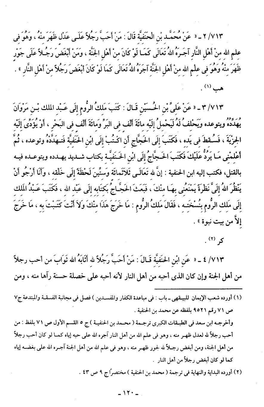 713/ 2 - "عَنْ مُحَمَّدِ بْنِ الحَنَفِيَّةِ قَالَ: مَنْ أَحَبَّ رَجُلًا عَلَى عَدْلٍ ظَهَرَ مِنْهُ، وَهُوَ فِى عِلم اللَّهِ مِنْ أَهْلِ النَّارِ آجَرَهُ اللَّهُ تَعَالَى كَمَا لَوْ كَانَ مِنْ أَهْلِ الْجَنَّةِ، وَمَنْ أَبْغَضَ رَجُلًا عَلَى جَوْرٍ ظَهَرَ مِنْهُ وَهُوَ فِى عِلم اللَّهِ مِنْ أَهْلِ الْجَنَّةِ آجَرَهُ اللَّهُ تَعَالَى كَمَا لَوْ كَانَ أبْغَضَ رَجُلًا مِنْ أَهْلِ النَّارِ".