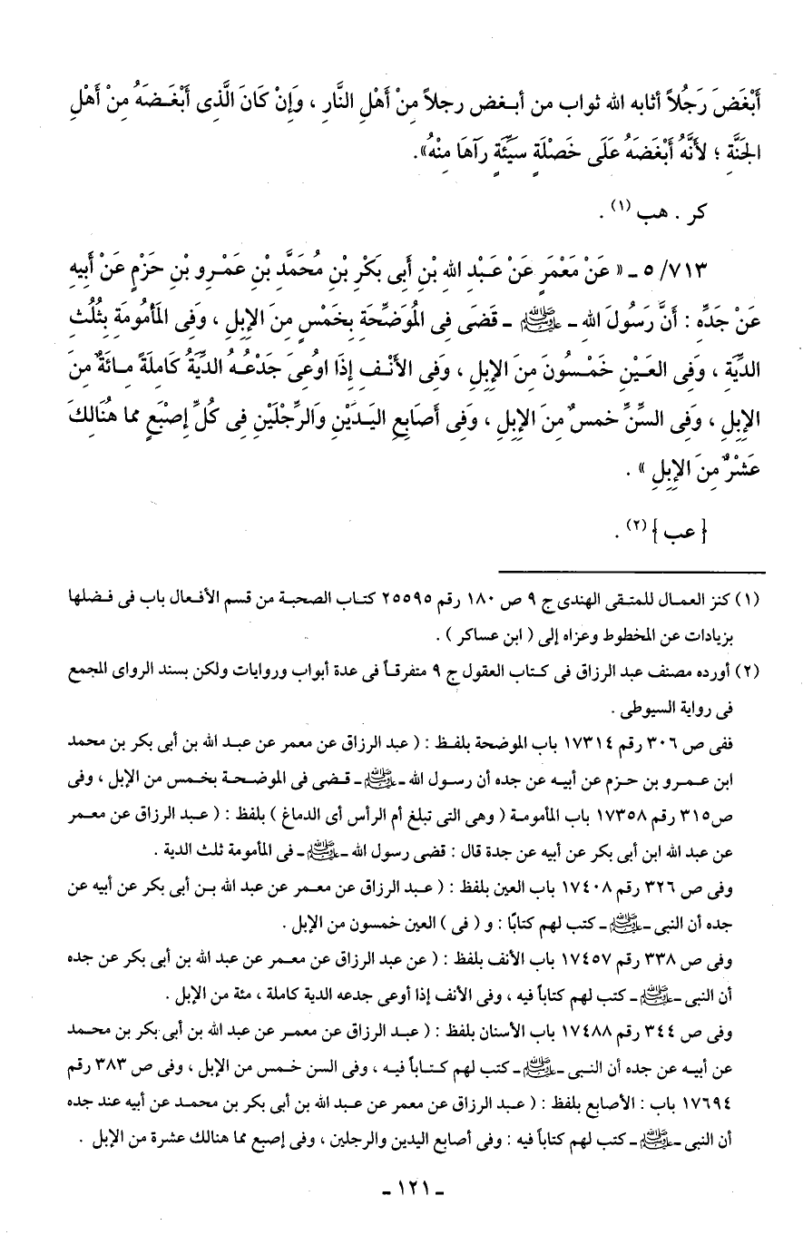 713/ 5 - "عَنْ مَعْمَرٍ عَنْ عَبْدِ اللَّهِ بْنِ أَبِى بَكْرِ بْنِ مُحَمَّدِ بْنِ عَمْرِو بْنِ حَزْمٍ عَنْ أبِيهِ عَنْ جَدِّهِ: أَنَّ رَسُولَ اللَّهِ -صلى اللَّه عليه وسلم- قَضَى فِى المُوَضِّحَةِ بِخَمْسٍ مِنَ الإِبِلِ، وَفِى المَأمُومَةِ بثُلُثِ الدِّيةِ، وَفِى العَيْنِ خَمْسُونَ مِنَ الإِبِلِ، وَفِى الأنْفِ إِذَا أوعى جَدْعُهُ الدِّيةُ كَامِلَةً مِائَةٌ مِنَ الإِبِلِ، وَفِى السِّنِّ خَمْسٌ مِنَ الإِبِلِ، وَفِى أصَابِعِ اليَدَيْنِ وَالرِّجْلَيْنِ فِى كُلِّ إِصْبَعٍ مما هُنَالِكَ عَشْرٌ مِنَ الإِبِلِ".