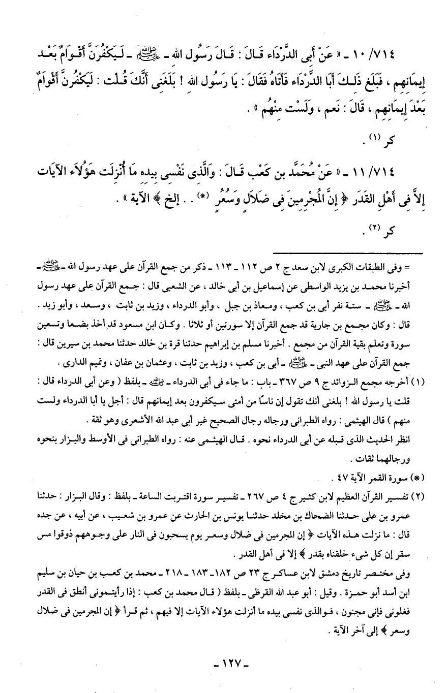 714/ 11 - "عَنْ مُحَمَّد بن كعْب قَالَ: وَالَّذِى نَفْسِى بِيدِهِ مَا أُنزِلَت هَؤُلَاء الآيَات إِلَّا فِى أَهْلِ القَدَر {إِنَّ الْمُجْرِمِينَ فِى ضَلَالٍ وَسُعُرٍ (*). . .} إلخ الآية".