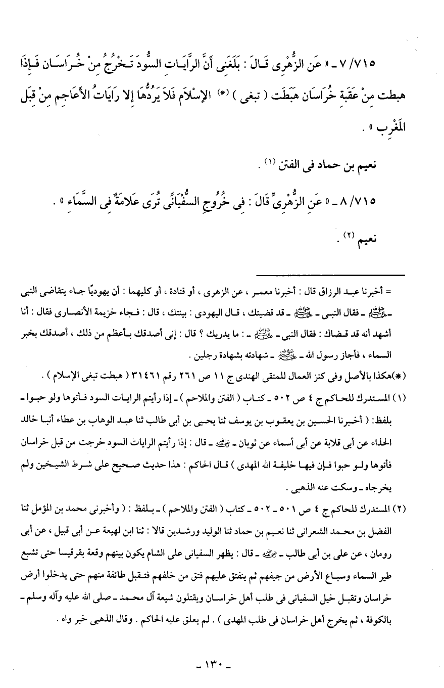 715/ 7 - "عَن الزُّهْرِىِّ قَالَ: بَلَغَنِى أَنَّ الرَّايَاتِ السُّودَ تَخْرُجُ مِنْ خُرَاسَان فَإِذَا هبطت مِنْ عَقَبةِ خُرَاسَان هَبَطَت (تبغى) (*) الإِسْلَام فَلَا يَرُدُّهَا إِلا رَايَاتُ الأَعَاجِم مِنْ قِبَل المَغْرِب".
