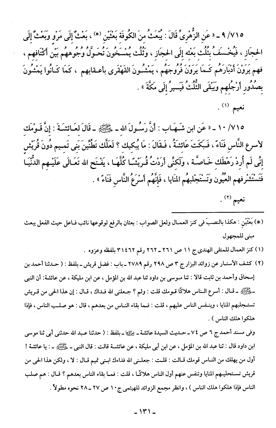 715/ 9 - "عَنِ الزُّهْرِىِّ قَالَ: يُبعَثُ مِنَ الكُوفَةِ بَعْثَيْنِ (*)، بَعْثٌ إِلَى مَرْوٍ وَبَعْثٌ إِلَى الحِجَازِ، فَيُخْسَفُ بِثُلُثِ بَعْثِه إِلَى الحِجَازِ، وَثُلُث يُمْسَخون تُحَوَّلُ وجُوههم بَيْن أكْتَافِهِم، فهم يَرَوْنَ أدْبَارَهُم كَمَا يَرَوْنَ فُرُوجَهُم، يَمْشُونَ القَهْقَرى بأعقابهم، كَمَا كَانُوا يَمْشُونَ بِصُدُورِ أرْجُلِهِم وَيَبْقَى الثُّلُثُ فَيَسيرُ إِلَى مَكَّةَ".
