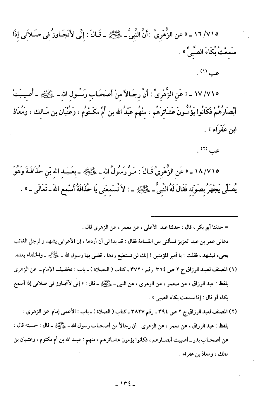 715/ 16 - "عن الزُّهْرِىِّ: أَنَّ النَّبِىَّ -صلى اللَّه عليه وسلم- قالَ: إِنِّى لأتَجَاوزُ فِى صَلَاتى إِذَا سَمِعْتُ بُكَاءَ الصَّبِىِّ".