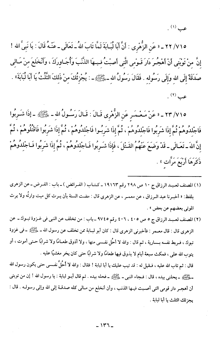 715/ 22 - "عَنِ الزُّهْرِىّ: أَنَّ أَبَا لُبَابَةَ لَمَّا تَابَ اللَّهُ -تَعَالَى- عَنْهُ قَالَ: يَا نَبِىَّ اللَّه! إِنَّ مِنْ تَوْبَتِى أَنْ أَهْجُرَ دَارَ قَوْمِى الَّتِى أَصبْتُ فِيهَا الذَّنْبَ وَأُجَاوِرَكَ، وَأَنْخَلعَ مِنْ مَالِى صَدَقَةً إِلَى اللَّهِ وَإِلَى رَسُولِهِ. فَقَالَ رَسُولُ اللَّهِ -صلى اللَّه عليه وسلم-: يُجْزِئُكَ مِنْ ذَلِكَ الثُّلُثُ يَا أَبَا لُبَابَةَ".