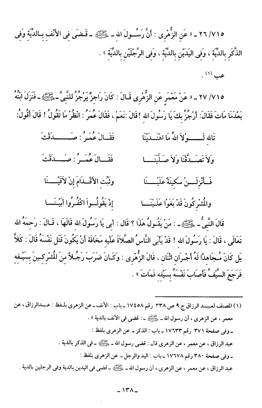 715/ 26 - "عَنِ الزُّهْرِىّ: أَنَّ رَسولَ اللَّهِ -صلى اللَّه عليه وسلم- قَضَى فِى الأنْفِ بِالدِّيةِ وَفِى الذَّكَرِ بِالدِّيةِ، وَفِى اليَدَيْنِ بِالدِّيةِ، وَفِى الرِّجْلَيْنِ بِالدَيةِ".