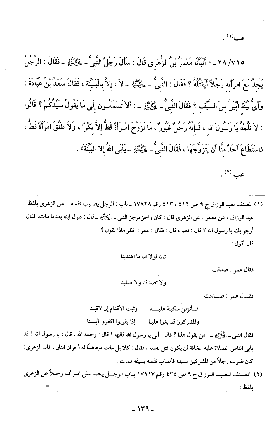 715/ 28 - " أَنْبَأنَا معْمَرُ بْنُ الزُّهْرِىّ قَالَ: سَأَلَ رَجُلٌ النَّبِىَّ -صلى اللَّه عليه وسلم- فَقَالَ: الرَّجُلُ يجِدُ مَعَ امْرَأته رَجُلًا أَيقتلُهُ؟ فَقَالَ: النَّبِىُّ -صلى اللَّه عليه وسلم- لَا، إِلَّا بِالبَيِّنِة، فَقَالَ سَعْدُ بْنُ عُبَادةَ: وَأَىُّ بيِّنةٍ أبْيَنُ مِنَ السَّيْفِ؟ فَقَالَ النَّبِىُّ -صلى اللَّه عليه وسلم-: أَلَا تَسْمَعُون إِلَى مَا يَقُولُ سيِّدُكمْ؟ قَالُوا: لَا تَلُمْهُ يَا رَسُولَ اللَّهِ، فَإِنَّهُ رَجُلٌ غَيُورٌ، مَا تَزَوَجَ امْرَأَةً قَطُّ إِلَّا بِكرًا، وَلَا طَلَّقَ امْرَأَةً قَط، فاسْتَطَاعَ أحَدٌ مِنَّا أَنْ يَتَزَوَّجَهَا، فَقَالَ النَّبِىُّ -صلى اللَّه عليه وسلم- يَأبَى اللَّهُ إِلا البيِّنةَ".