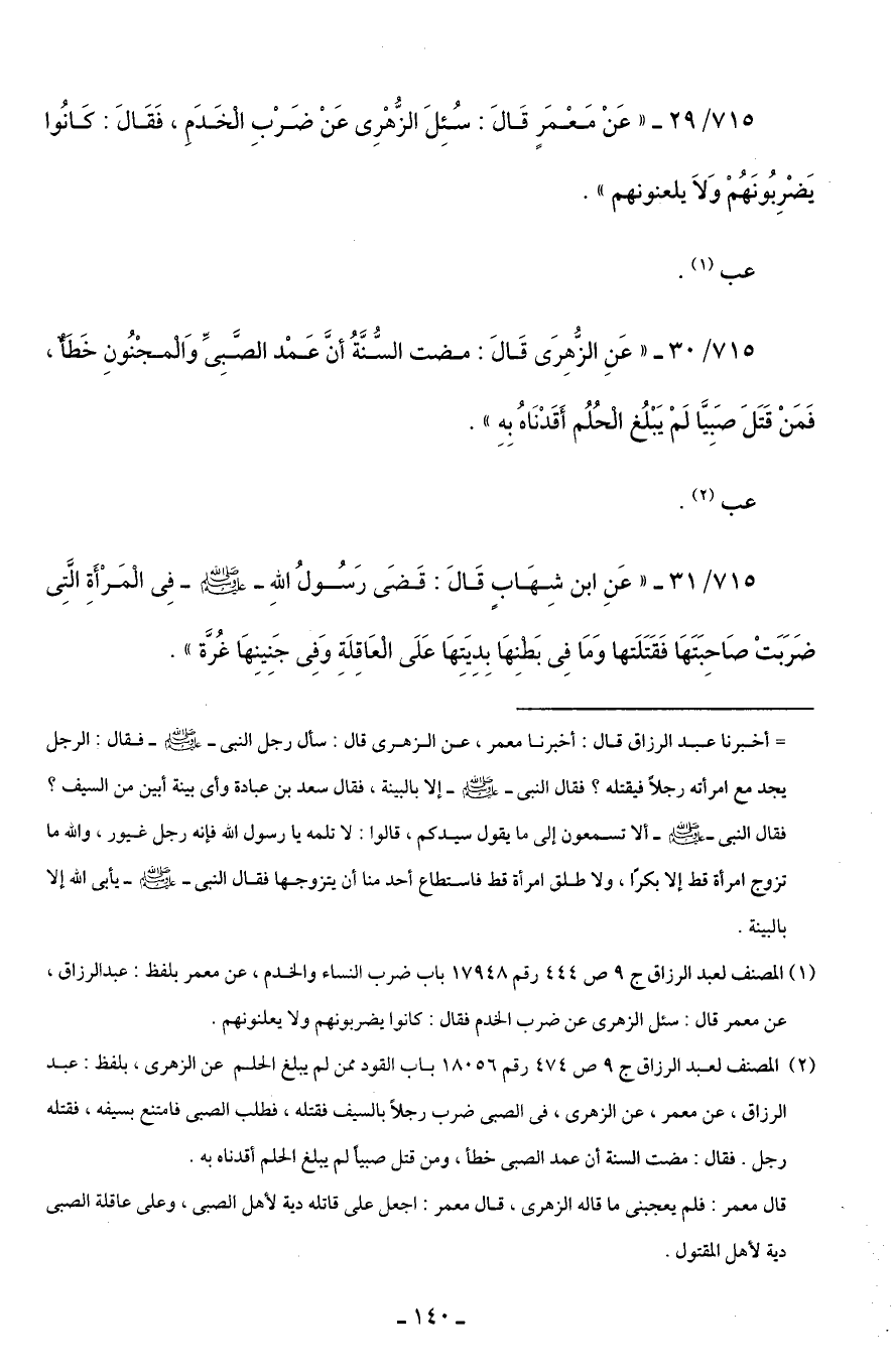 715/ 29 - "عَنْ مَعْمَرٍ قَالَ: سُئِلَ الزُّهْرِىّ عَنْ ضَرْبِ الخَدَمِ، فَقَالَ: كَانُوا يَضْرِبُونَهُمْ وَلَا يلعنونهم".