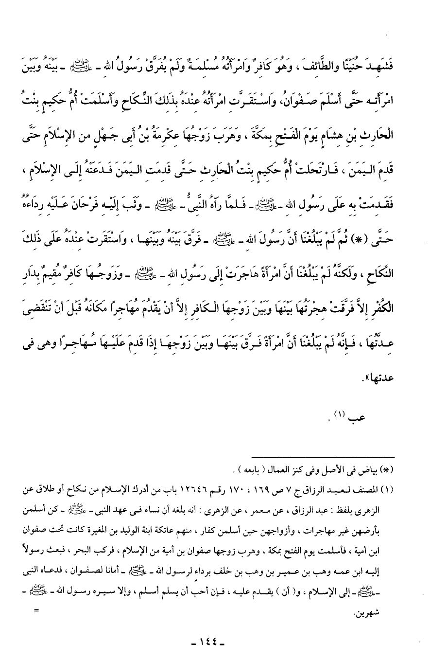 فَشَهِدَ حُنَيْنًا والطَّائِفَ، وَهُوَ كَافِرٌ وَامْرَأَتُهُ مُسْلِمَةٌ وَلَمْ يُفرِّقْ رَسُولُ اللَّهِ -صلى اللَّه عليه وسلم- بَيْنَهُ وَبَيْنَ امْرَأتِه حَتَّى أَسْلَمَ صَفْوَانُ، وَاسْتَقَرَّتِ امْرَاتُهُ عِنْدَهُ بِذَلِكَ النِّكَاحِ وَأَسْلَمَتْ أُمُّ حَكِيمٍ بِنْتُ الحَارِثِ بْنِ هِشَامٍ يَوْمَ الفَتْحِ بِمَكَّةَ، وَهَرَبَ زَوْجُهَا عِكْرِمَةُ بْنُ أَبِى جَهْلٍ من الإِسْلَامِ حَتَّى قَدِمَ اليَمَنَ، فَارْتَحَلتْ أُمُّ حَكِيمٍ بِنْتُ الحَارِثِ حَتَّى قَدِمَتِ اليَمَنَ فَدَعَتْهُ إِلَى الإِسْلَامِ، فَقَدِمَتْ بِهِ عَلَى رَسُولِ اللَّهِ -صلى اللَّه عليه وسلم- فَلمَّا رآهُ النَّبِى -صلى اللَّه عليه وسلم- وَثَبَ إِلَيْهِ فَرْحَانَ عَلَيْهِ رِدَاءُهُ حَتَّى (*) ثُمَّ لَمْ يَبْلُغْنَا أَنَّ رَسُولَ اللَّهِ -صلى اللَّه عليه وسلم- فَرَّقَ بَيْنَهُ وَبَيْنَها، وَاسْتَقَرَّتْ عِنْدَهُ عَلَى ذَلِكَ النكاحِ، وَلَكنَّهُ لَمْ يَبْلُغْنَا أَنَّ امْرَأَةً هَاجَرَتْ إِلَى رَسُولِ اللَّهِ -صلى اللَّه عليه وسلم- وَزَوجُهَا كَافِرٌ مُقِيمٌ بِدَارِ الكُفْرِ إِلَّا فَرَّقَتْ هِجْرَتُهَا بَيْنَهَا وَبَيْنَ زَوْجِهَا الكَافِرِ إِلَّا أَنْ يَقْدُمَ مُهَاجِرًا مَكَانَهُ قَبْلَ أَنْ تَنْقَضِى عِدتهَا، فَإِنَّهُ لَمْ يَبْلُغْنَا أَنَّ امْرَأةً فَرَّقَ بَيْنَهَا وَبَيْنَ زَوْجِهَا إِذَا قَدِمَ عَلَيْهَا مُهَاجِرًا وهى في عدتها".