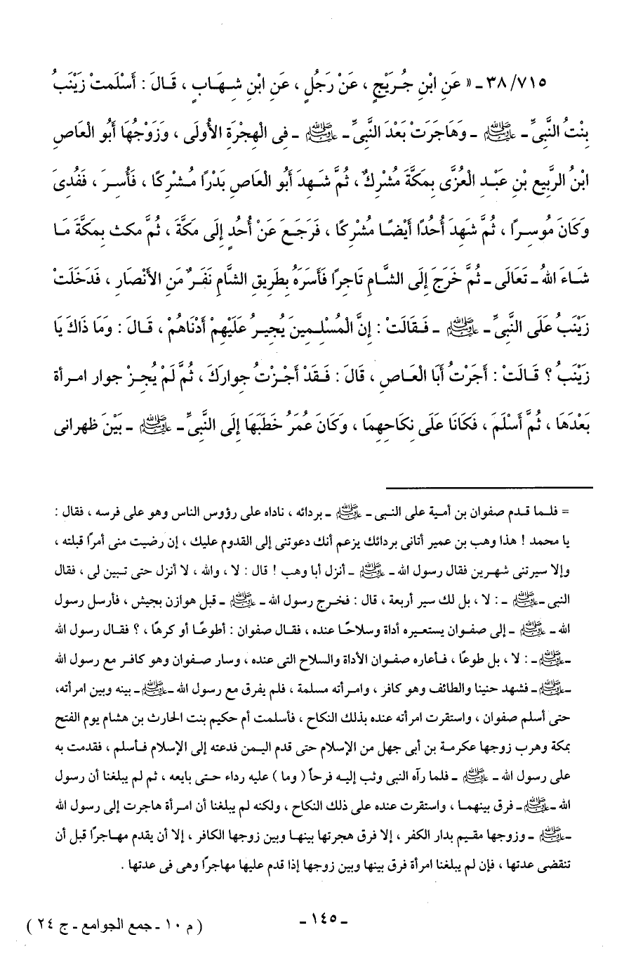 715/ 38 - "عَنِ ابْنِ جُرَيْجٍ، عَنْ رَجُلٍ، عَنِ ابْنِ شِهَابٍ، قَالَ: أَسْلَمتْ زَيْنَبُ بِنْتُ النَّبِىِّ -صلى اللَّه عليه وسلم- وَهَاجَرَتْ بَعْدَ النَّبِىِّ -صلى اللَّه عليه وسلم- فِى الْهِجْرَةِ الأُولَى، وَزَوْجُهَا أَبُو الْعَاصِ ابْنُ الرَّبِيع بْنِ عَبْدِ الْعُزَّى بِمَكَّةَ مُشْرِكٌ، ثُمَّ شَهِدَ أَبُو الْعَاصِ بَدْرًا مُشْرِكًا، فَأُسِرَ، فَفُدِىَ وَكَانَ مُوسِرًا، ثُمَّ شَهِدَ أُحُدًا أَيْضًا مُشْرِكًا، فَرَجَعَ عَنْ أُحُدٍ إِلَى مَكَّةَ، ثُمَّ مكث بِمَكَّةَ مَا شَاءَ اللَّهُ -تَعَالَى- ثُمَّ خَرَجَ إِلَى الشَّامِ تَاجِرًا فَأَسَرَهُ بِطَرِيقِ الشَّامِ نَفَرٌ مَنِ الأَنْصَارِ، فَدَخَلَتْ زَيْنَبُ عَلَى النَّبِىِّ -صلى اللَّه عليه وسلم- فَقَالَتْ: إِنَّ الْمُسْلِمِينَ يُجِيرُ عَلَيْهِمْ أَدْنَاهُمْ، قَالَ: وَمَا ذَاكَ يَا زَيْنَبُ؟ قَالَتْ: أَجَرْتُ أَبَا الْعَاصِ، قَالَ: فَقَدْ أَجْزْتُ جِوارَكَ، ثُمَّ لَمْ يُجِزْ جوار امرأة بَعْدَهَا، ثُمَّ أَسْلَمَ، فَكَانَا عَلَى نِكَاحِهِمَا، وَكَانَ عُمَرُ خَطَبَهَا إِلَى النَّبِىِّ -صلى اللَّه عليه وسلم- بَيْنَ ظهرانى