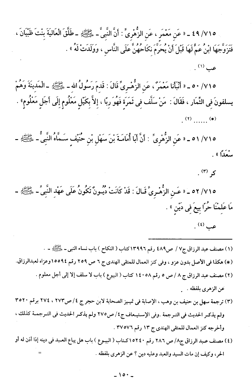 715/ 50 - "أَنْبَأَنا مَعْمَرٌ، عَنِ الزُّهْرِىِّ قَالَ: قَدِمَ رَسُولُ اللَّهِ -صلى اللَّه عليه وسلم- الْمَدِينَةَ وَهُمْ يسلفونَ فِى الثِّمَار، فَقَالَ: مَنْ سَلَّف فِى ثَمَرَةٍ فَهُوَ رِبًا، إِلَّا بِكَيْلٍ مَعْلُومٍ إِلَى أَجَلٍ مَعْلُومٍ".