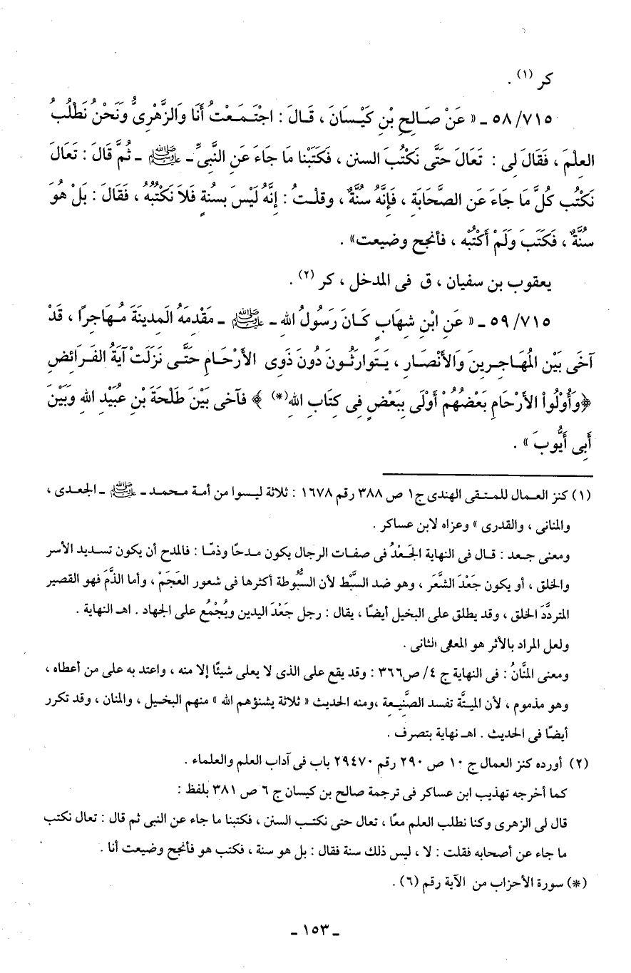715/ 58 - "عَنْ صَالِحِ بْنِ كَيْسَانَ، قَالَ: اجْتَمَعْتُ أَنَا وَالزُّهْرِىُّ وَنَحْنُ نَطْلُبُ العِلمَ، فَقَالَ لِى: تَعَالَ حَتَّى نَكْتُبَ السنن، فَكَتَبْنا مَا جَاءَ عَنِ النَّبِىِّ -صلى اللَّه عليه وسلم- ثُمَّ قَالَ: تَعَالَ نَكْتُب كُلَّ مَا جَاءَ عَن الصَّحَابَةِ، فَإِنَّهُ سُنَّةٌ، وقلْتُ: إِنَّهُ لَيْسَ بسُنةٍ فَلَا نَكْتُبُهُ، فَقَالَ: بَلْ هُوَ سُنَّةٌ، فَكَتَبَ وَلَمْ أَكْتُبْه، فأنجح وضيعت".
