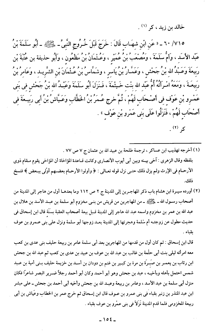 715/ 60 - "عَنِ ابْنِ شِهَابٍ قَالَ: خَرَجَ قَبْلَ خُرُوجِ النَّبِىِّ -صلى اللَّه عليه وسلم- أَبُو سَلَمَةَ بْنُ عَبْد الأَسَدِ، وَأمُّ سَلَمَةَ، وَمُصْعَبُ بْنُ عُمَيْرٍ، وَعُثْمَانُ بْنُ مَظعُونٍ، وَأَبُو حذيفة بن عُتْبَةَ بْن رَبِيعَةَ وَعَبْدُ اللَّهِ بْنُ جَحْشٍ، وَعَمَّارُ بْنُ يَاسِرٍ، وشَمَّاسُ بْنُ عُثْمَانَ بْنِ الشَّرِيدِ، وَعَامِرُ بْنُ رَبِيعَةَ، وَمَعَهُ امْرَأَتُهُ أُمُّ عَبْدِ اللَّهِ بِنْتِ خَيثْمَةَ، فَنَزَلَ أَبُو سَلَمَةَ وَعَبْدُ اللَّهِ بْنُ جَحْشٍ فِى بَنِى عَمْرِو بْنِ عَوْفٍ فِى أَصْحَابٍ لَهُمْ، ثُمَّ خرج عُمَرُ بْنُ الخَطَّابِ وَعَيَّاشُ بْنُ أَبِى رَبِيعَةَ فِى أَصْحَابٍ لَهُمْ، فَنَزَلُوا عَلَى بَنِى عَمْرو بْنِ عَوْفٍ".