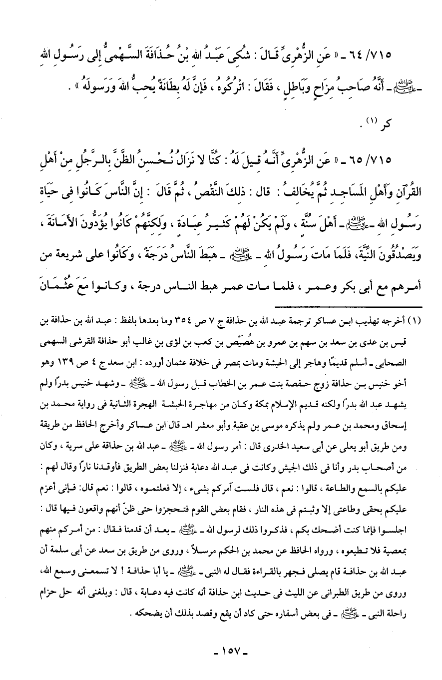 715/ 64 - "عَنِ الزُّهْرِىِّ قَالَ: شُكِىَ عَبْدُ اللَّهِ بْنُ حُذَافَةَ السَّهْمىُّ إِلى رَسُولِ اللَّهِ -صلى اللَّه عليه وسلم- أَنَّهُ صَاحِبُ مِزَاحٍ وَبَاطِلٍ، فَقَالَ: اتْرُكُوهُ، فَإنَّ لَهُ بِطَانَةً يُحِبُّ اللَّهَ وَرَسولَهُ".