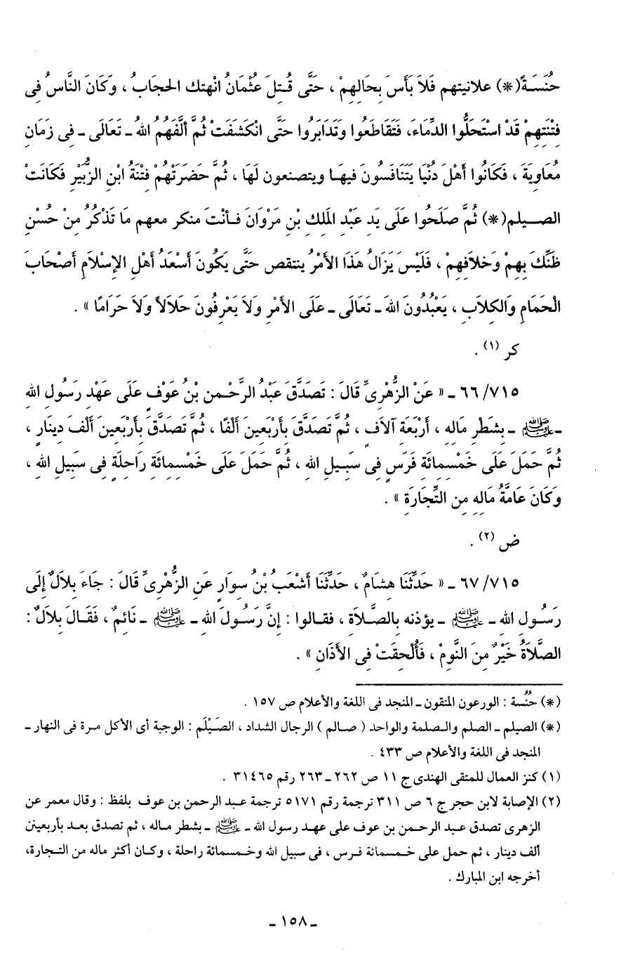 715/ 66 - "عَنْ الزُّهْرِىِّ قَالَ: تَصَدَّقَ عَبْدُ الرَّحْمن بْنُ عَوْفٍ عَلَى عَهْد رَسُولِ اللَّهِ -صلى اللَّه عليه وسلم- بِشَطْرِ مَالِهِ، أَرْبَعَةِ آلَاف، ثُمَّ تَصَدَّقَ بِأَرْبَعِينَ أَلْفًا، ثُمَّ تَصَدَّقَ بِأَرْبَعِينَ أَلْفَ دِينَارٍ، ثُمَّ حَمَلَ عَلَى خَمْسِمائَةِ فَرَسٍ فِى سَبِيلِ اللَّهِ، ثُمَّ حَمَلَ عَلَى خمْسِمِائَةِ رَاحِلَةٍ فِى سَبِيلِ اللَّهِ، وَكَانَ عَامَّةُ مَالِهِ مِن التِّجَارَةِ".
