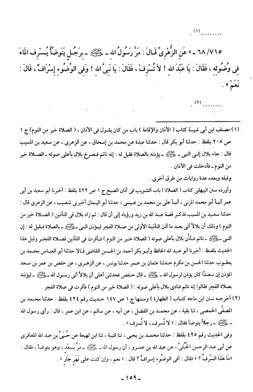 715/ 68 - "عَنِ الزُّهْرِىِّ قَالَ: مَرَّ رَسُولُ اللَّهِ -صلى اللَّه عليه وسلم- بِرَجُلٍ يَتَوضَّأُ يُسْرِف المَاءَ فِى وضُوئِهِ، فَقَالَ: يَا عَبْدَ اللَّه! لَا تُسْرِفْ، فَقَالَ: يَا نَبِىَّ اللَّهِ! وَفِى الوُضُوءِ إِسْرَافٌ، قَالَ: نَعَمْ".
