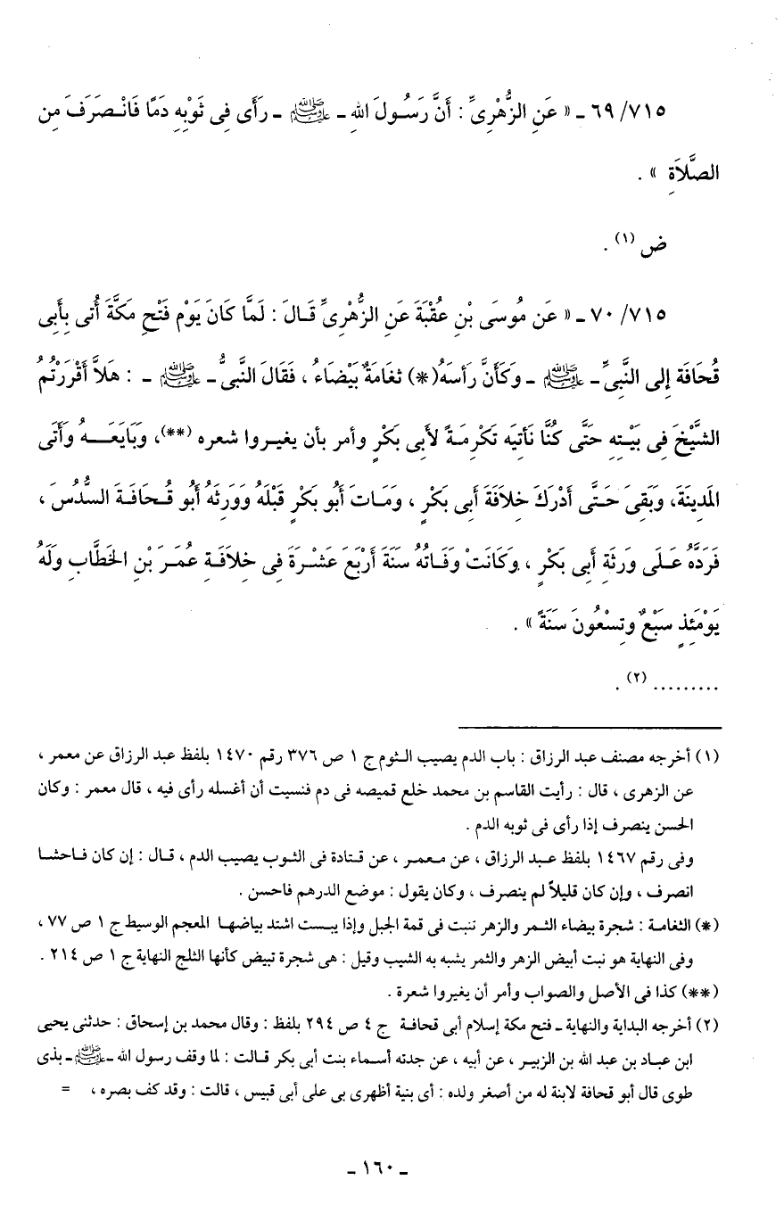 715/ 69 - "عَنِ الزُّهْرِىِّ: أَنَّ رَسُولَ اللَّهِ -صلى اللَّه عليه وسلم- رَأَى فِى ثَوْبِهِ دَمًا فَانْصَرَفَ مِن الصَّلَاةِ".