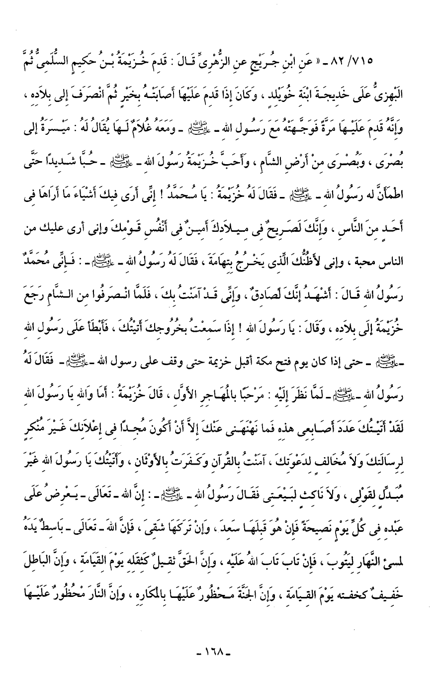715/ 82 - "عَنِ ابْنِ جُرَيْجٍ عنِ الزُّهْرِىِّ قَالَ: قَدِمَ خُزَيْمَةُ بْنُ حَكِيمٍ السُّلَمِىُّ ثُمَّ الَبْهِزىُّ عَلَى خَدِيجَةَ ابْنَةِ خُوَيْلِدٍ، وَكَانَ إِذَا قَدِمَ عَلَيْهَا أَصَابَتْهُ بِخَيْرٍ ثُمَّ انْصَرَفَ إِلى بِلَادِهِ، وَإِنَّهُ قَدِمَ عَلَيْهَا مَرَّةً فَوَجَّهَتْهُ مَعَ رَسُولِ اللَّهِ -صلى اللَّه عليه وسلم- وَمَعَهُ غُلَامٌ لَهَا يُقَالُ لَهُ: مَيْسَرَةُ إلى بُصْرَى، وَبُصْرَى مِنْ أَرْضِ الشَّامِ، وَأَحَبَّ خُزَيْمَةُ رَسُولَ اللَّهِ -صلى اللَّه عليه وسلم- حُبَّا شَدِيدًا حَتَّى اطْمَأَنَّ له رَسُولُ اللَّهِ -صلى اللَّه عليه وسلم- فَقَالَ لَهُ خُزَيْمَةُ: يَا مُحَمَّدُ! إِنِّى أَرَى فِيكَ أَشْيَاءَ مَا أَرَاهَا فِى أَحَدٍ مِنَ النَّاسِ، وَإنَّكَ لَصَرِيحٌ فِى مِيلَادِكَ أَمِينٌ فِى أَنْفُسِ قَوْمِكَ وإنى أرى عليك من الناس محبة، وإنى لأَظُنُّكَ الَّذِى يَخْرُجُ بِتِهَامَةَ، فَقَالَ لَهُ رَسُولُ اللَّهِ -صلى اللَّه عليه وسلم-: فَإِنِّى مُحَمَّدٌ رَسُولُ اللَّهِ قَالَ: أشْهَدُ إنَّكَ لَصَادِقٌ، وَإِنِّى قَدْ آمَنْتُ بِكَ، فَلَمَّا انْصَرفُوا مِن الشَّامِ رَجَعَ خُزَيْمَةُ إلَى بِلَادِهِ، وَقَالَ: يَا رَسُولَ اللَّهِ! إِذَا سَمِعْتُ بخُرُوجِكَ أتيْتُكَ، فَأَبْطَأ عَلَى رَسُولِ اللَّهِ -صلى اللَّه عليه وسلم- حتى إذا كان يوم فتح مكة أقبل خزيمة حتى وقف على رسول اللَّه -صلى اللَّه عليه وسلم- فَقَالَ لَهُ رَسُولُ اللَّهِ -صلى اللَّه عليه وسلم- لَمَّا نَظَرَ إِلَيْهِ: مَرْحَبًا بالمُهَاجِرِ الأَوَّلِ، قَالَ خُزَيْمَةُ: أَمَا وَاللَّهِ يَا رَسُولَ اللَّهِ لَقَدْ أتَيْتُكَ عَدَدَ أصَابِعِى هذِهِ فَما نَهْنَهَنى عَنْكَ إِلَّا أَنْ أَكُونَ مُجِدًا فِى إِعْلَانِكَ غَيْرَ مُنْكِر لِرِسَالَتِكَ وَلَا مُخَالِفٍ لِدَعْوَتِكَ، آمَنْتُ بِالقُرآنِ وَكَفَرَتُ بِالأَوْثَانِ، وَأَتَيْتُكَ يَا رَسُولَ اللَّهِ غَيْرَ مُبَدِّلٍ لِقَوْلِى، وَلَا نَاكِثٍ لبَيْعَتِى فَقَالَ رَسُولُ اللَّهِ -صلى اللَّه عليه وسلم-: إِنَّ اللَّه -تَعَالَى- يَعْرِضُ عَلَى عَبْدهِ فِى كُلِّ يَوْمٍ نَصِيحَةً فَإِنْ هُوَ قَبِلَهَا سَعِدَ، وَإِنْ تَرَكَهَا شَقِىَ، فَإنَّ اللَّهَ -تَعَالَى- بَاسِطٌ يَدَهُ لمسئ النَّهَارِ لِيَتُوبَ، فَإِنْ تَابَ تَابَ اللَّهُ عَلَيْهِ، وَإِنَّ الحَقَّ ثقِيلٌ كثِقَلِهِ يَوْمَ الِقَيَامَةِ، وَإِنَّ البَاطِلَ خَفِيفٌ كخفته يَوْمَ الْقِيَامَةِ، وَإِنَّ الجَنَّةَ مَحْظُورٌ عَلَيْهَا بِالْمكَارِهِ، وَإِنَّ النَّارَ مْحُظُورٌ عَلَيْهَا