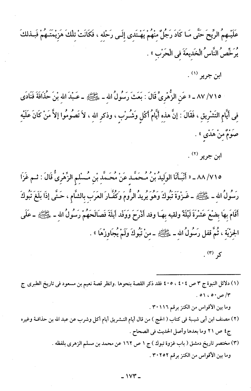 715/ 88 - "أَنْبَأَنَا الوَلِيدُ بْنُ مُحَمَّدٍ عَنْ مُحَمَّدِ بْنِ مُسْلِمٍ الزّهْرِىّ قَالَ: ثم غَزَا رَسُولُ اللَّهِ -صلى اللَّه عليه وسلم- غَزْوَةَ تَبُوكَ وَهُوَ يُريدُ الرُّومَ وَكُفَّارَ العَرَبِ بِالشَّامِ، حَتَّى إِذَا بَلَغَ تَبُوكَ أَقَامَ بِهَا بِضع عَشْرَةَ لَيْلَةً ولقيه بِهَا وفد أَذْرَحَ وَوَفْد أَيلَةَ فَصَالَحَهُمْ رَسُولُ اللَّهِ -صلى اللَّه عليه وسلم- عَلَى الجِزْيَةِ، ثُمَّ قفل رَسُولُ اللَّهِ -صلى اللَّه عليه وسلم- مِن تَبُوكَ وَلَمْ يُجَاوِزْهَا".
