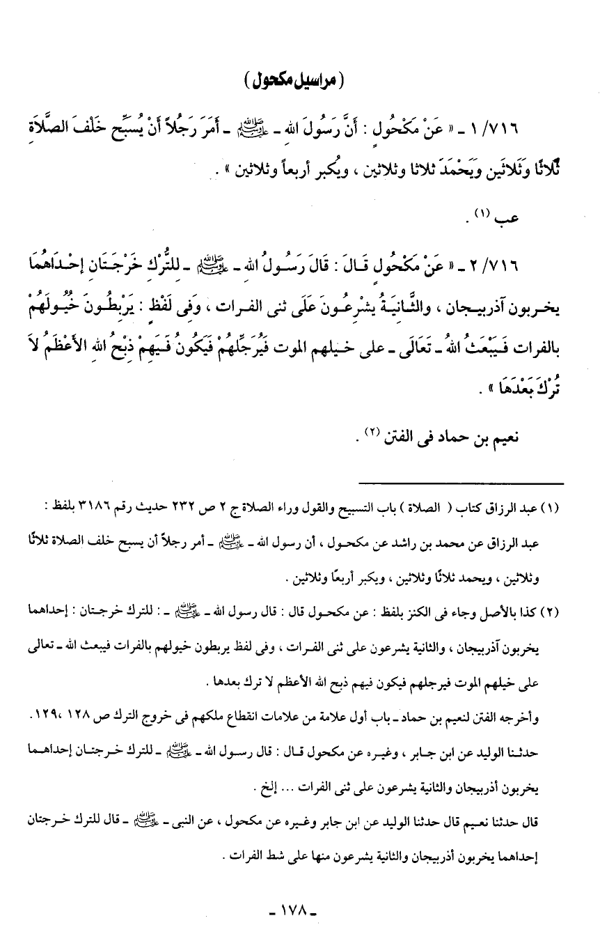 716/ 2 - "عَنْ مَكْحُولٍ قَالَ: قَالَ رَسُولُ اللَّهِ -صلى اللَّه عليه وسلم- لِلتُّرْكِ خَرْجَتَانِ إحْدَاهُمَا يخربون آذربيجان، والثَّانِيَةُ يشْرِعُونَ عَلَى ثنى الفرات، وَفِى لَفْظٍ: يَرْبِطُونَ خُيُولَهُمْ بالفرات فَيَبْعَثُ اللَّهُ -تَعَالَى- على خيلهم الموت فَيُرَجِّلهُمْ فَيَكُونُ فيَهِمْ ذِبْحُ اللَّهِ الأَعْظَمُ لَا تُرْكَ بَعْدَهَا".
