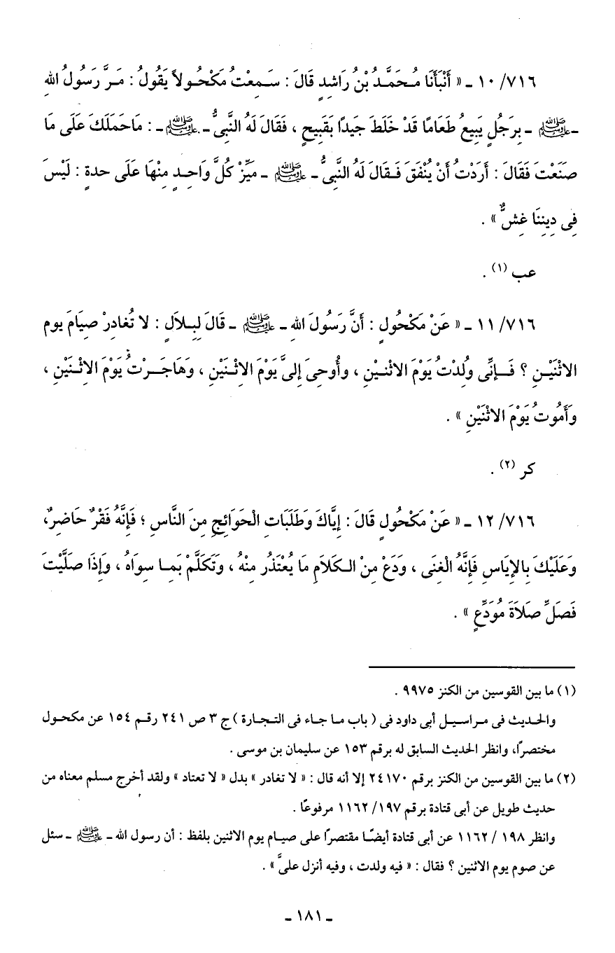 716/ 11 - "عَنْ مَكْحُولٍ: أَنَّ رَسُولَ اللَّهِ -صلى اللَّه عليه وسلم- قَالَ لِبِلَالٍ: لا تُغادِرْ صِيَامَ يوم الاثْنَيْنِ؟ فَإنِّى ولُدْتُ يَوْمَ الاثْنيْنِ، وأُوحِى إِلىّ يَوْمَ الاِثْنَيْنِ، وَهَاجَرْتُ يَوْمَ الاِثْنَيْنِ، وَأَمُوتُ يَوْمَ الاثْنَيْنِ".
