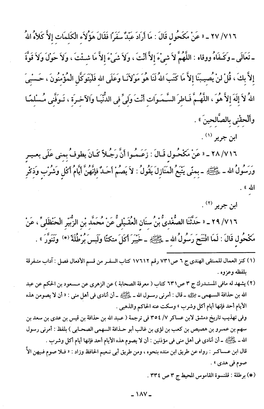 716/ 28 - "عَنْ مَكْحُولٍ قَالَ: زَعَمُوا أَنَّ رَجُلًا كَانَ يطوفُ بِمِنى عَلَى بعيرٍ وَرَسُولُ اللَّه -صلى اللَّه عليه وسلم- بِمِنَّى يَتْبَعُ الْمَنَازِلَ يَقُولُ: لَا يَصُمْ أَحَدٌ فِإنَّهُنَّ أَيَّامُ اكْلٍ وَشُرْبٍ وَذِكْرِ اللَّهِ".