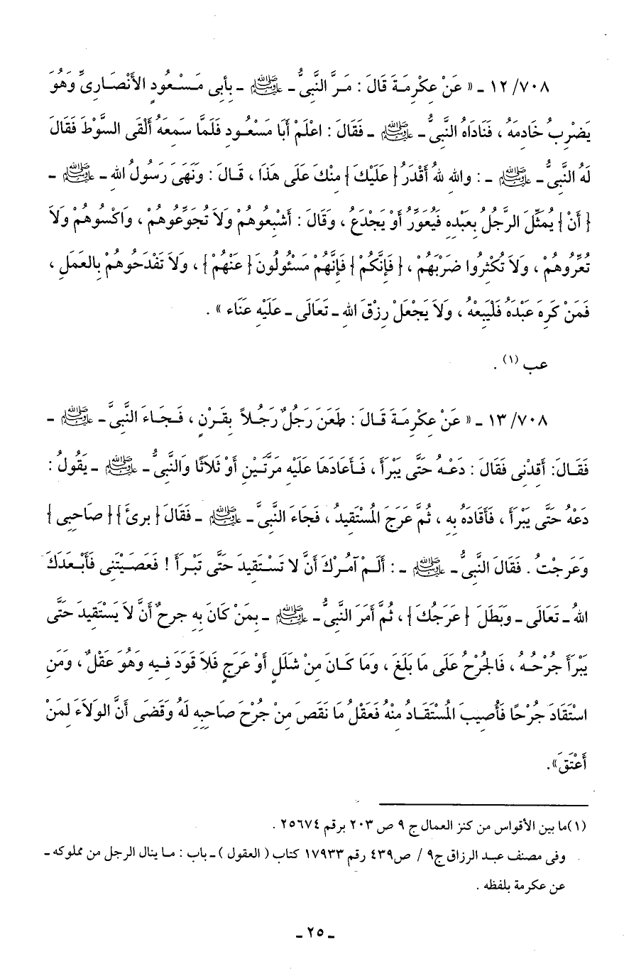 708/ 13 - "عَنْ عِكْرِمَةَ قَالَ: طَعَنَ رَجُلٌ رَجُلًا بِقَرْنٍ، فَجَاءَ النَّبِىَّ -صلى اللَّه عليه وسلم- فَقَالَ: أَقِدْنِى فَقَالَ: دَعْهُ حَتَّى يَبْرَأَ، فَأَعَادَهَا عَلَيْهِ مَرَّتَيْنِ أَوْ ثَلاثًا وَالنَّبِىُّ -صلى اللَّه عليه وسلم- يَقُولُ: دَعْهُ حَتَّى يَبْرَأَ، فَأَقَادَهُ بِهِ، ثُمَّ عَرَجَ المُسْتَقِيدُ، فَجَاءَ النَّبِىَّ -صلى اللَّه عليه وسلم- فَقَالَ [برئَ] [صَاحِبِى] وَعَرَجْتُ. فَقَالَ النَّبِىُّ -صلى اللَّه عليه وسلم-: أَلَمْ أمُرْكَ أَنَّ لا تَسْتَقِيدَ حَتَّى تَبْرَأَ! فَعَصَيْتَنِى فَأَبْعَدَكَ اللَّهُ -تَعَالَى- وَبَطَلَ [عَرَجُكَ]، ثُمَّ أَمَرَ النَّبِىُّ -صلى اللَّه عليه وسلم- بِمَنْ كَانَ بِهِ جرحٌ أَن لَا يسْتَقِيدَ حَتَّى يَبْرَأَ جُرْحُهُ، فَالجُرْحُ عَلَى مَا بَلَغَ، وَمَا كَانَ مِنْ شَلَلٍ أَوْ عَرَج فَلَا قَوَدَ فِيهِ وَهُوَ عَقْل، وَمَنِ اسْتَقَادَ جُرْحًا فَأُصِيبَ المُسْتَقَادُ مِنْهُ فَعَقْلُ مَا نَقَصَ مِنْ جُرْحَ صَاحِبِهِ لَهُ وَقَضَى أَنَّ الوَلَاءَ لِمَنْ أَعْتَقَ".
