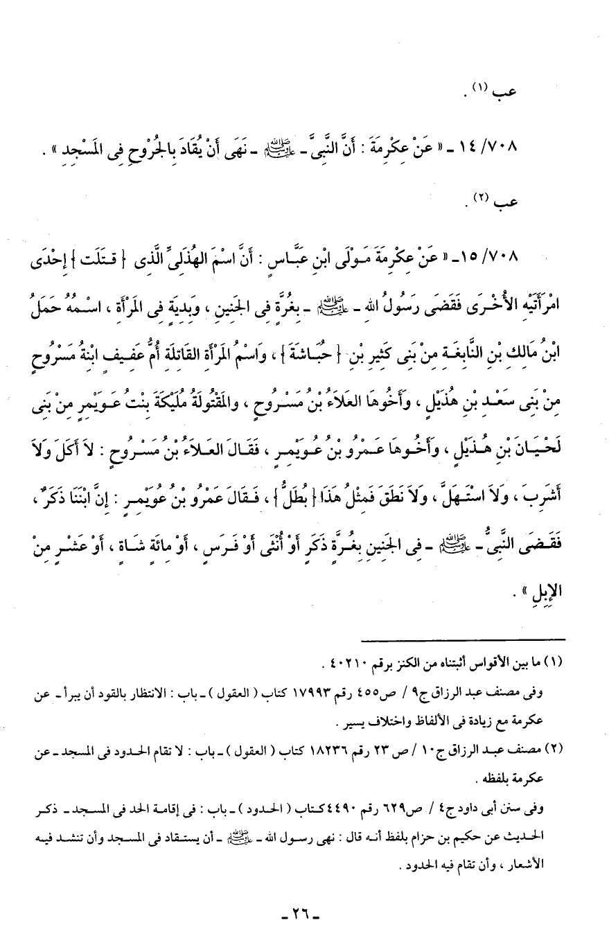 708/ 15 - "عَنْ عِكْرِمَةَ مَوْلَى ابْنِ عَبَّاسٍ: أَنَّ اسْمَ الهُذَلِىِّ الَّذِى [قَتَلَت] إِحْدَى امْرَأَتَيْهِ الأُخرَى فَقَضَى رَسُولُ اللَّهِ -صلى اللَّه عليه وسلم- بِغُرَّةٍ فِى الجَنِينِ، وَبِدِيَةٍ فِى المَرْأَةِ، اسْمُهُ حَمَلُ ابْنُ مَالِكِ بْنِ النَّابِغَةِ مِنْ بَنِى كثِيرِ بْنِ [حُبَاشَةَ]، وَاسْمُ المَرْأَةِ القَاتِلَةِ أُمُّ عَفِيفٍ ابْنِةُ مَسْرُوحٍ مِنْ بَنِى سَعْدِ بْنِ هُذَيْلٍ، وَأَخُوهَا العَلَاءُ بْنُ مَسْرُوحٍ، والمَقْتُولَةُ مُلَيْكَةَ بِنْتُ عَوَيْمِرٍ مِنْ بَنِى لَحْيَانَ بْنِ هُذَيْلٍ، وَأَخُوهَا عَمْرُو بْنُ عُوَيْمِرٍ، فَقَالَ العَلَاءُ بْنُ مَسْرُوحٍ: لَا أَكَلَ وَلَا أَشَرِبَ، وَلَا اسْتَهَلَّ، وَلَا نَطَقَ فَمِثْلُ هَذَا [بُطَلُّ]، فَقَالَ عَمْرُو بْنُ عُوَيْمِر: إِنَّ ابْنَنَا ذَكَرٌ، فَقَضَى النَّبِىُّ -صلى اللَّه عليه وسلم- فِى الجَنِينِ بِغُرَّةٍ ذَكَر أَوْ أُنثَى أَوْ فَرَسٍ، أَوْ مِائَةٍ شَاةٍ، أَوْ عَشْرٍ مِنْ الإِبِلِ".