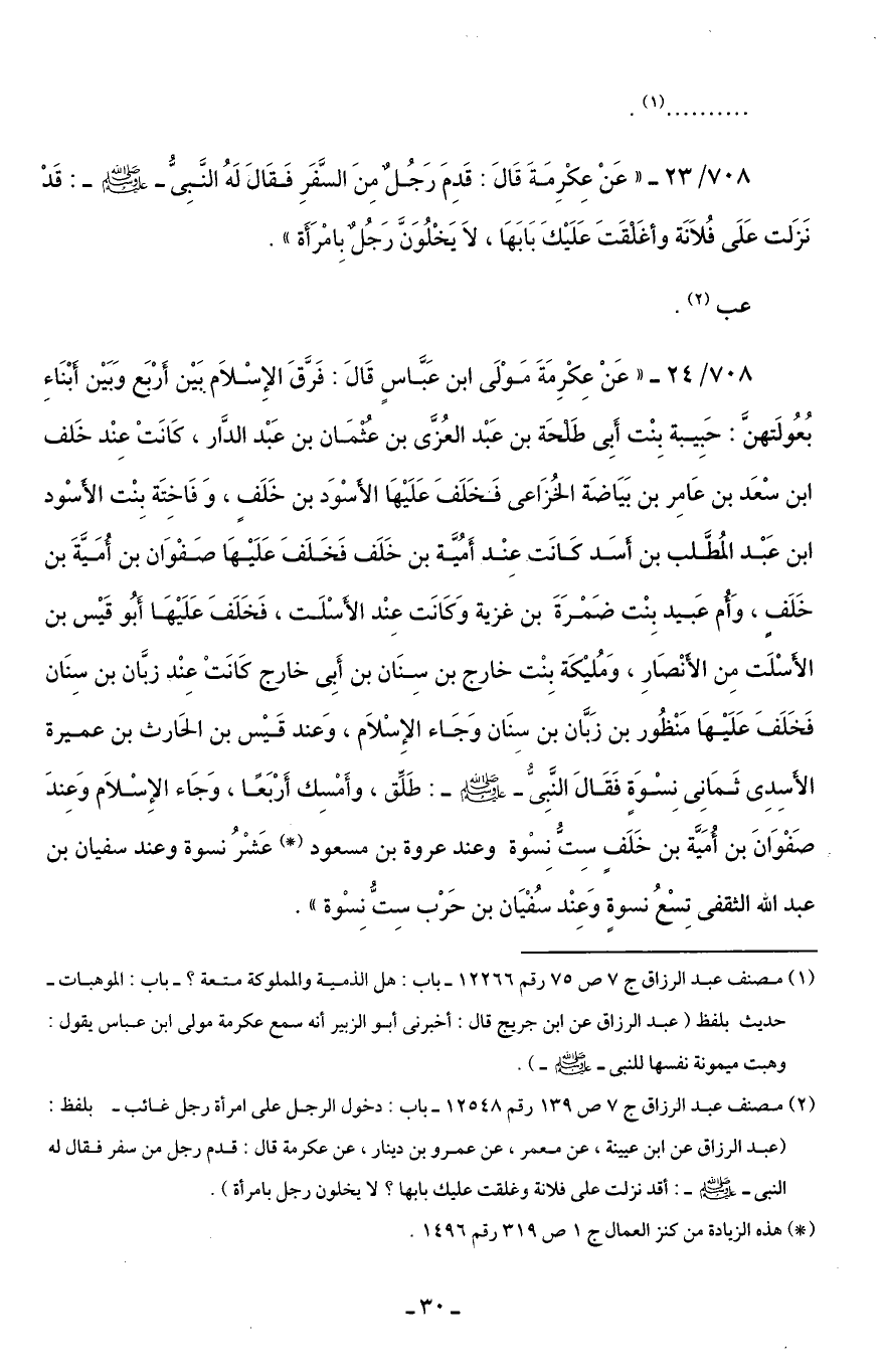 708/ 24 - "عَنْ عِكْرِمَةَ مَوْلَى ابن عَبَّاسٍ قَالَ: فَرَّقَ الإِسْلَام بَيْن أَرْبَع وَبَيْن أَبْنَاءِ بُعُولَتهنَّ: حَبِيبة بِنْت أَبِى طَلحَة بن عَبْد العُزَّى بن عُثْمَان بن عَبْد الدَّار، كَانَتْ عِنْد خَلف ابن سْعَد بن عَامِر بن بَيَاضَة الخُزَاعى فَخَلَفَ عَلَيْهَا الأَسْوَد بن خَلَفٍ، وَفَاخِتَة بِنْت الأَسْود ابن عَبْد المُطَّلب بن أَسَد كَانَت عِنْد أَمُيَّة بن خَلَف فَخَلَفَ عَلَيْهَا صَفْوَان بن أُمَيَّةَ بن خَلَف، وَأُم عَبيد بِنْت ضَمْرَةَ بن غزية وَكَانَت عِنْد الأَسْلَت، فَخَلَفَ عَلَيْهَا أَبُو قَيْس بن الأَسْلَت مِن الأَنْصَارِ، وَمُليْكَة بِنْت خارج بن سِنَان بن أَبِى خارج كَانَتْ عِنْد زبَّان بن سِنَان فَخَلَفَ عَلَيْهَا مَنْظُور بن زَبَّان بن سِنَان وَجَاء الإِسْلَام، وعند قَيْس بن الحَارث بن عميرة الأَسِدِى ثَمَانِى نِسْوَةٍ فَقَالَ النَّبِى -صلى اللَّه عليه وسلم-: طَلِّق، وأَمْسِك أَرْبَعًا، وَجَاء الإِسْلَام وَعِندَ صَفْوَانَ بن أُمَيَّة بن خَلَفٍ سِتُّ نِسْوة وعند عروة بن مسعود (*) عَشْرُ نسوة وعند سفيان بن عبد اللَّه الثقفى تِسْعُ نسوةٍ وَعِنْد سُفْيَان بن حَرْب سِتُّ نِسْوة".