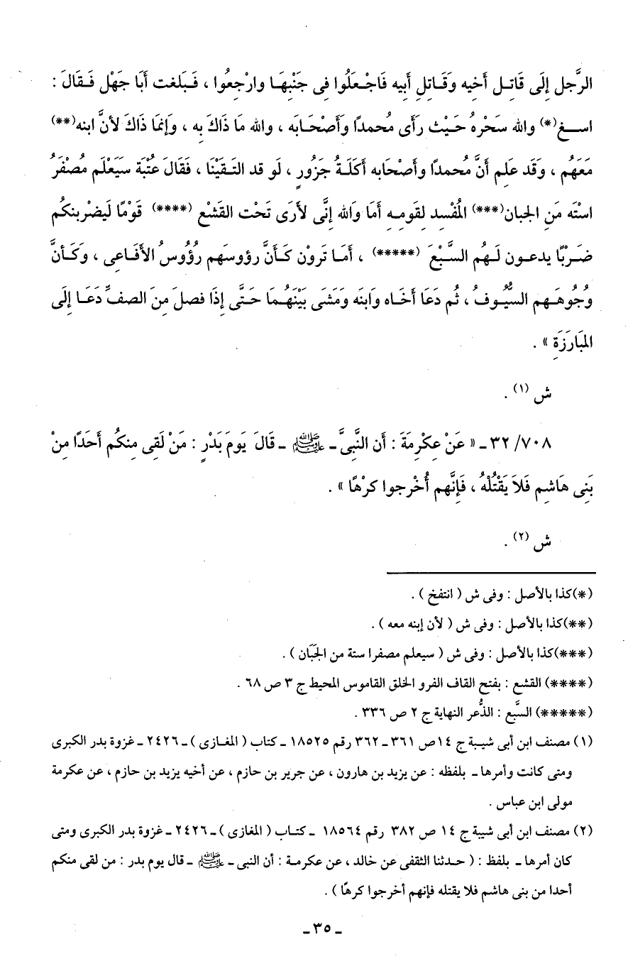 (¬2) مصنف ابن أبى شيبة جـ 14 ص 382 رقم 18564 - كتاب (المغازى) - 2426 - غزوة بدر الكبرى ومتى كان أمرها - بلفظ: (حدثنا الثقفى عن خالد، عن عكرمة: أن النبى -صلى اللَّه عليه وسلم- قال يوم بدر: من لقى منكم أحدا من بنى هاشم فلا يقتله فإنهم أخرجوا كرهًا).