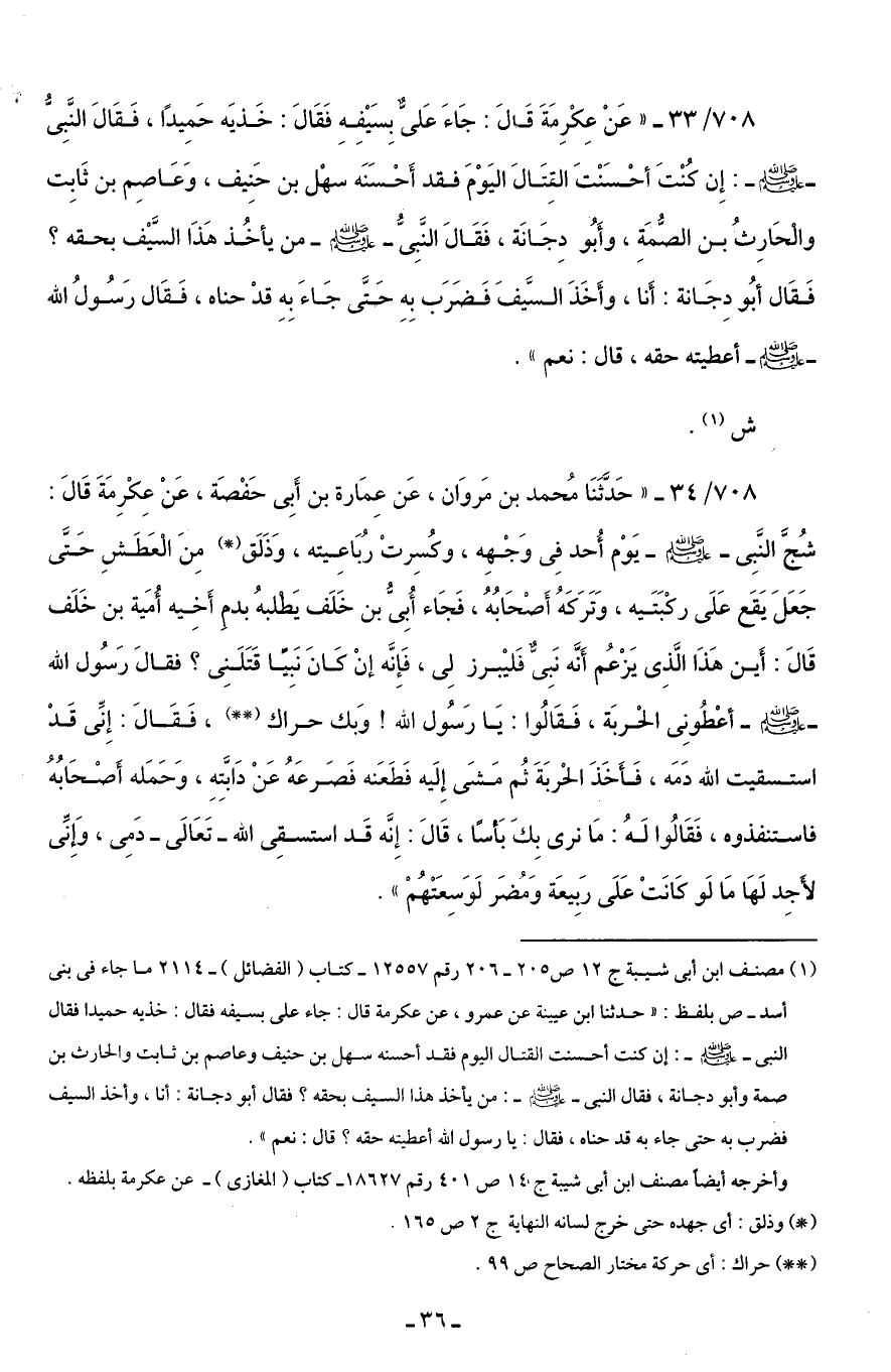 708/ 33 - "عَنْ عِكْرِمَة قَالَ: جَاءَ عَلىٌّ بِسَيْفِهِ فَقَالَ: خَذيَه حَمِيدًا، فَقَالَ النَّبِىُّ -صلى اللَّه عليه وسلم-: إِنَّ كُنْتَ أحْسَنْتَ القِتَالَ اليَوْمَ فقد أَحْسَنَه سهْل بن حَنِيف، وَعَاصِم بن ثَابِت والْحَارِثُ بن الصُّمَةِ، وأَبُو دِجَانَة، فَقَالَ النَّبِىُّ -صلى اللَّه عليه وسلم- من يأخُذ هَذَا السَّيْف بحقه؟ فَقَال أبُو دِجَانة: أَنَا، وأَخَذَ السَّيفَ فَضَرَب بِهِ حَتَّى جَاءَ بِهِ قدْ حناه، فَقَال رَسُولُ اللَّه -صلى اللَّه عليه وسلم- أعطيته حقه، قال: نعم".