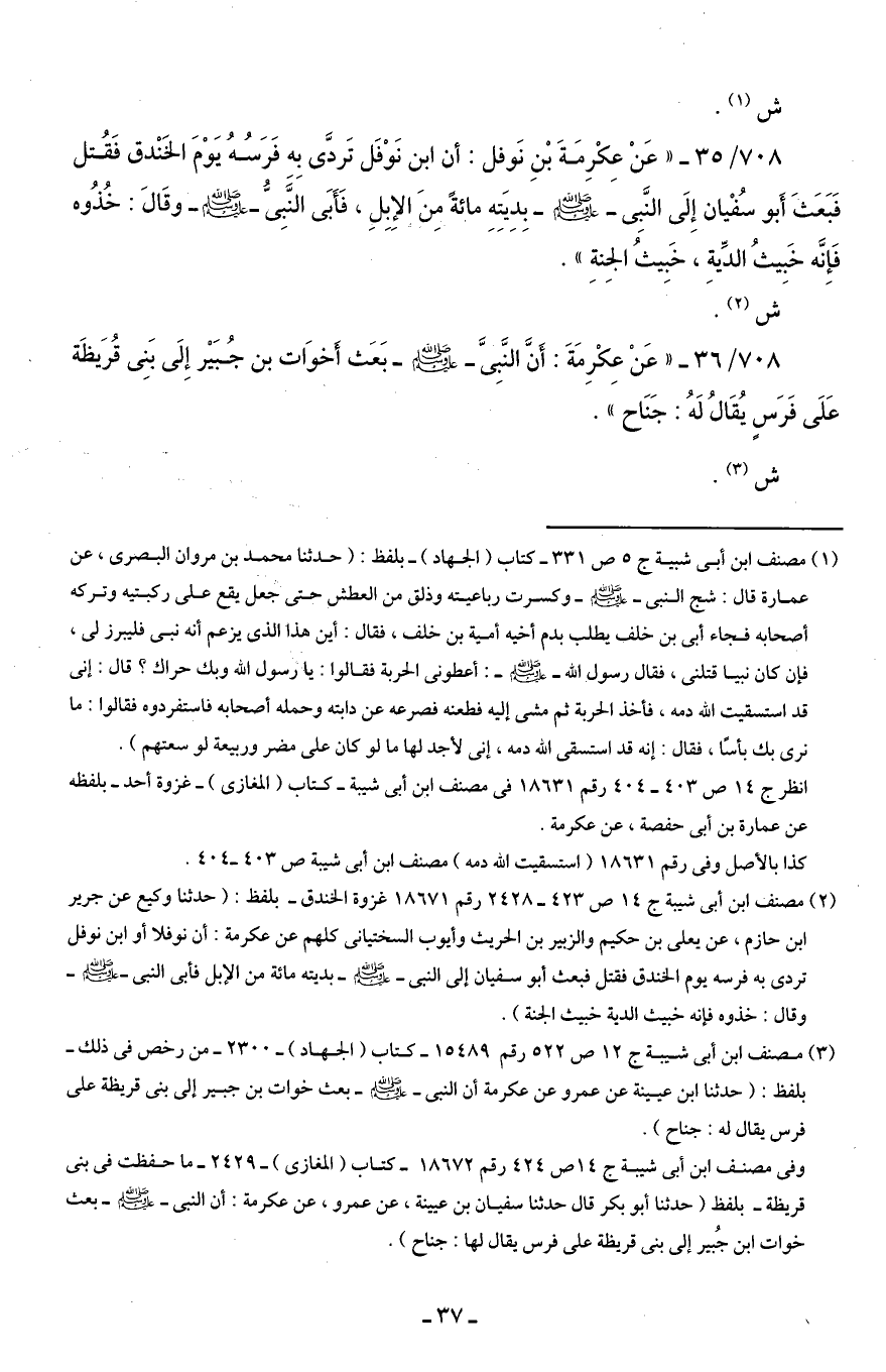 708/ 35 - "عَنْ عِكْرِمَةَ بْنِ نَوفل: أن ابن نَوْفَل تَردَّى بِه فَرَسُهُ يَوْمَ الخَنْدق فَقُتل فَبَعَثَ أَبو سُفْيان إِلَى النَّبِىِّ -صلى اللَّه عليه وسلم- بِدِيَتِهِ مائةً مِنَ الإِبِلِ، فَأَبَى النَّبِىُّ -صلى اللَّه عليه وسلم- وقَالَ: خُذُوه فَإِنَّه خَبِيثُ الدِّيةِ، خَبِيثُ الجِنةِ".