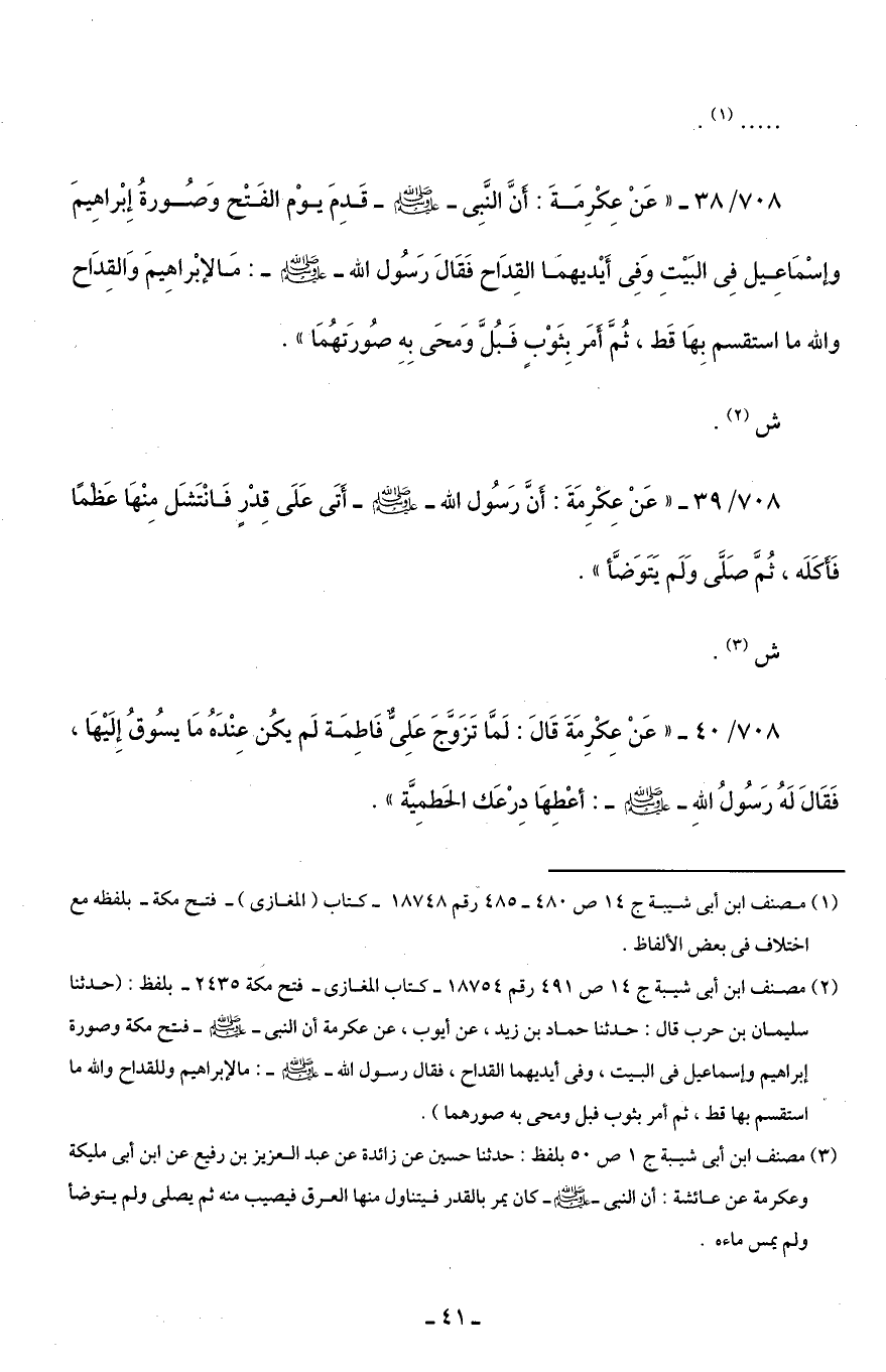 (¬2) مصنف ابن أبى شيبة جـ 14 ص 491 رقم 18754 - كتاب المغازى - فتح مكة 2435 - بلفظ: (حدثنا سليمان بن حرب قال: حدثنا حماد بن زيد، عن أيوب، عن عكرمة أن النبى -صلى اللَّه عليه وسلم- فتح مكة وصورة إبراهيم وإسماعيل في البيت، وفى أيديهما القداح، فقال رسول اللَّه -صلى اللَّه عليه وسلم-: مالإبراهيم وللقداح واللَّه ما استقسم بها قط، ثم أمر بثوب فبل ومحى به صورهما).