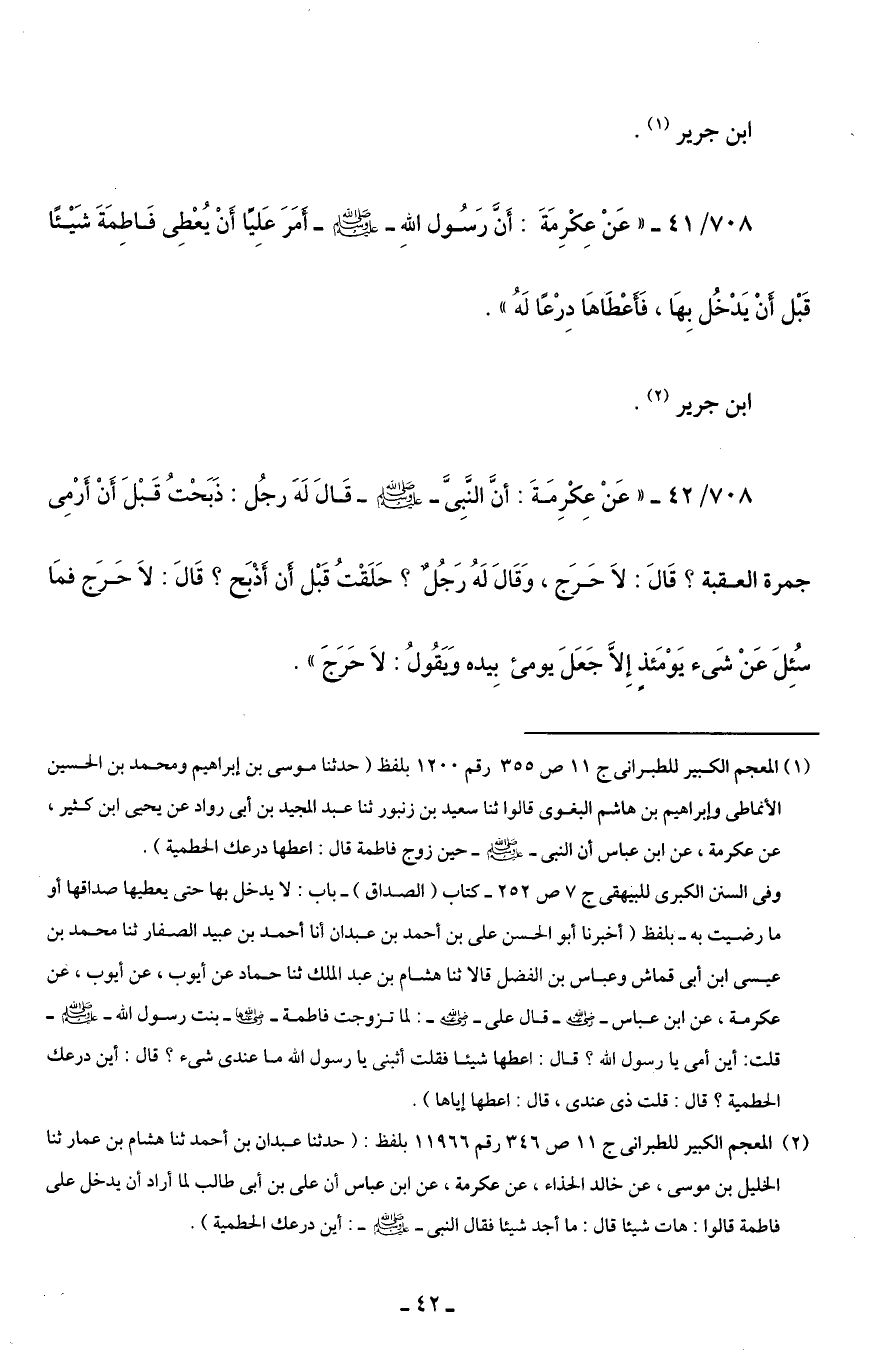 (¬1) المعجم الكبير للطبرانى جـ 11 ص 355 رقم 1200 بلفظ (حدثنا موسى بن إبراهيم ومحمد بن الحسين الأَنماطى وإبراهيم بن هاشم البغوى قالوا ثنا سعيد بن زنبور ثنا عبد المجيد بن أَبى رواد عن يحيى ابن كثير، عن عكرمة، عن ابن عباس أن النبى -صلى اللَّه عليه وسلم- حين زوج فاطمة قال: اعطها درعك الحطمية).