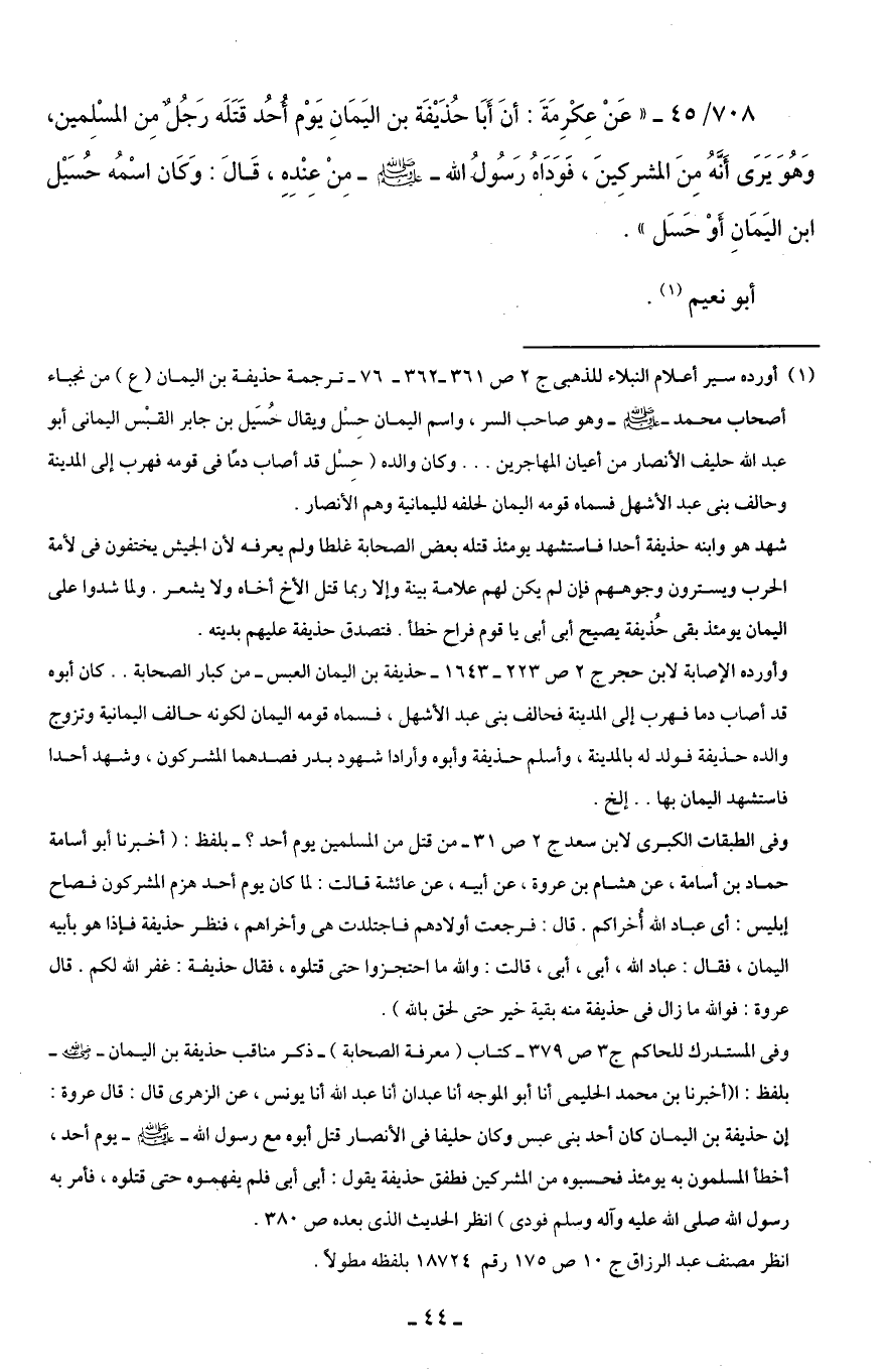708/ 45 - "عَنْ عِكْرِمَةَ: أنَ أَبَا حُذَيْفَة بن اليَمَانِ يَوْم أُحُد قَتَلَه رَجُل مِن المسْلِمين، وَهُوَ يَرَى أَنَّهُ مِنَ المشركينَ، فَوَدَاهُ رَسُولهُ اللَّه -صلى اللَّه عليه وسلم- مِنْ عِنْدِهِ، قَالَ: وَكَان اسْمُه حُسَيْل ابن اليَمَانِ أَوْ حَسَل".