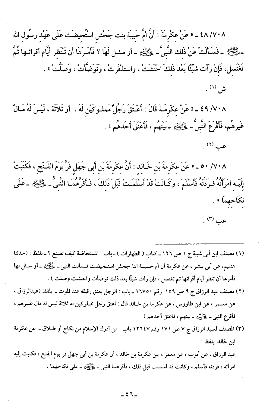 708/ 50 - "عَنْ عِكْرِمَةَ بْنِ خَالِدٍ: أَنَّ عِكْرِمَةَ بْنِ أَبِى جَهْلٍ فَرَّ يَوْمَ الفَتْحِ، فَكَتَبَتْ إِلَيْهِ امْرَاتُهُ فرَدَّتْهُ فَأَسْلَمَ، وَكَانَتْ قَدْ أَسْلَمَتْ قَبْلَ ذَلِكَ، فَأَقَرَّهُمَا النَّبِىُّ -صلى اللَّه عليه وسلم- عَلَى نِكَاحِهِمَا".