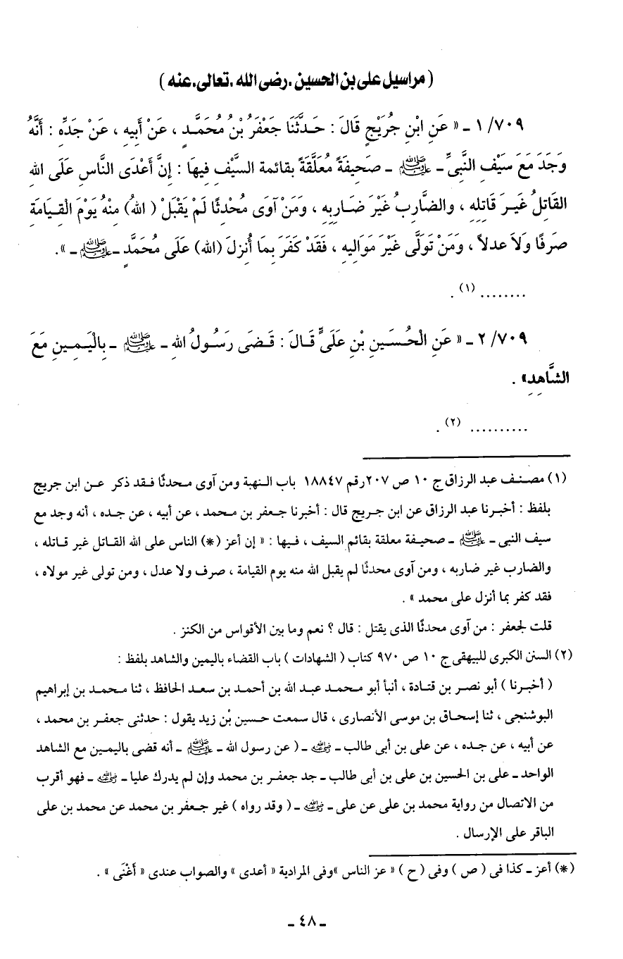 709/ 1 - " عَنِ ابْنِ جُرَيْجٍ قَالَ: حَدَّثنَا جَعْفَرُ بْنُ مُحَمَّدٍ، عَنْ أَبِيهِ، عَنْ جَدِّهِ: أَنَّهُ وَجَدَ مَعَ سَيْفِ النَّبِىِّ -صلى اللَّه عليه وسلم- صَحِيفَةً مُعَلَّقَةً بقائمة السَّيْفِ فِيهَا: إِنَّ أَعْدَى النَّاسِ عَلَى اللَّهِ القَاتِلُ غَيرَ قَاتِلِهِ، والضَّارِبُ غَيْرَ ضَارِبِهِ، وَمَنْ آوَى مُحْدِثًا لَمْ يَقْبَلْ (اللَّهُ) مِنْهُ يَوْمَ الْقِيَامَةِ صَرفًا وَلَا عدلًا، وَمَنْ تَوَلَّى غَيْرَ مَوَالِيهِ، فَقَدْ كَفَرَ بِمَا أُنِزلَ (اللَّه) عَلَى مُحَمَّدٍ -صلى اللَّه عليه وسلم-".