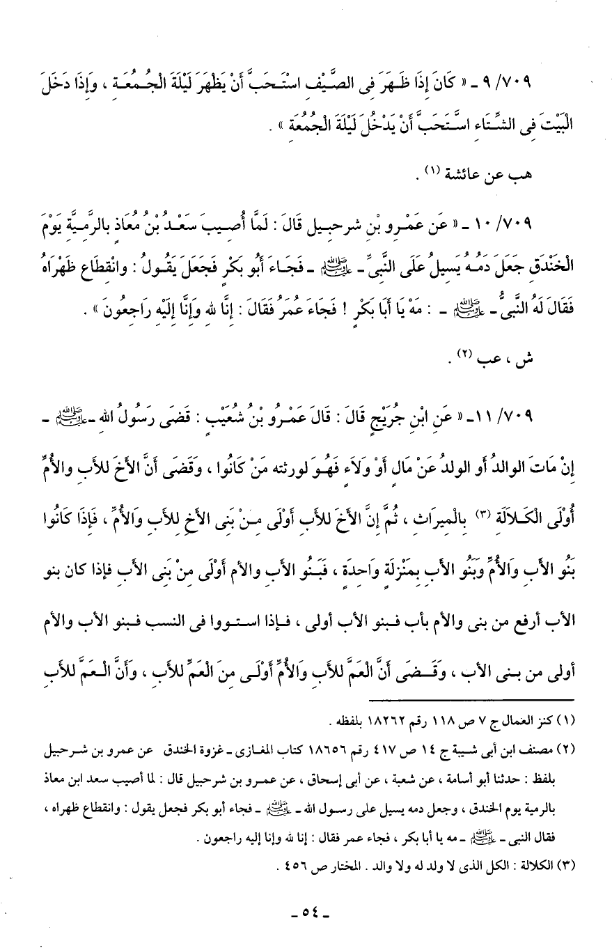 709/ 11 - "عَنِ ابْنِ جُرَيْجٍ قَالَ: قَالَ عَمْرُو بْنُ شُعَيْبٍ: قَضَى رَسُولُ اللَّهِ -صلى اللَّه عليه وسلم- إِنْ مَاتَ الوالدُ أَو الولدُ عَنْ مَالٍ أَوْ وَلَاء فَهُوَ لورثته مَنْ كَانُوا، وَقَضَى أَنَّ الأَخ للأَبِ والأُمِّ أُوْلَى الْكَلَالَةِ (¬3) بِالْمِيرَاثِ، ثُمَّ إِنَّ الأَخَ للأَبِ أَوْلَى مِن بَنِى الأَخِ لِلأَبِ وَالأُمِّ، فَإِذَا كَانُوا بَنُو الأَبِ وَالأُمِّ وَبَنُو الأَبِ بِمَنْزلَةٍ وَاحِدَةٍ، فَبَنُو الأَبِ والأُمِّ أَوْلَى مِنْ بَنِى الأَبِ فإذا كان بنو الأَب أرفع من بنى والأم بأب فبنو الأَب أولى، فإذا استووا في النسب فبنو الأَب والأَم أولى من بنى الأَب، وَقَضَى أَنَّ الْعَمَّ للأَبِ، وَالأُمِّ أَوْلَى مِنَ الْعَمِّ للأَبِ، وَأَنَّ الْعَمَّ للأَبِ