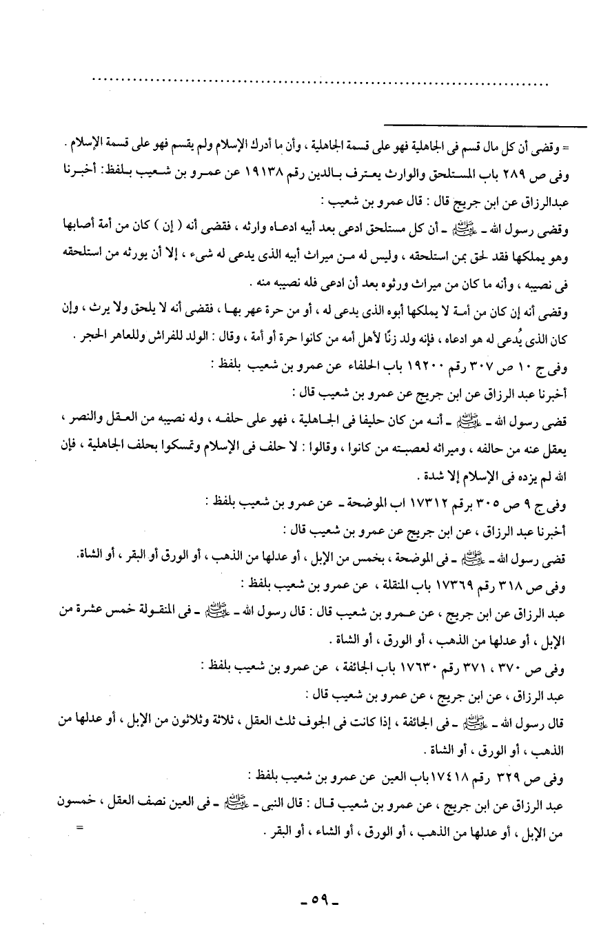 = وقضى أن كل مال قسم في الجاهلية فهو على قسمة الجاهلية، وأن ما أدرك الإسلام ولم يقسم فهو على قسمة الإسلام. وفى ص 289 باب المستلحق والوارث يعترف بالدين رقم 19138 عن عمرو بن شعيب بلفظ: أخبرنا عبد الرازق عن ابن جريج قال: قال عمرو بن شعيب: